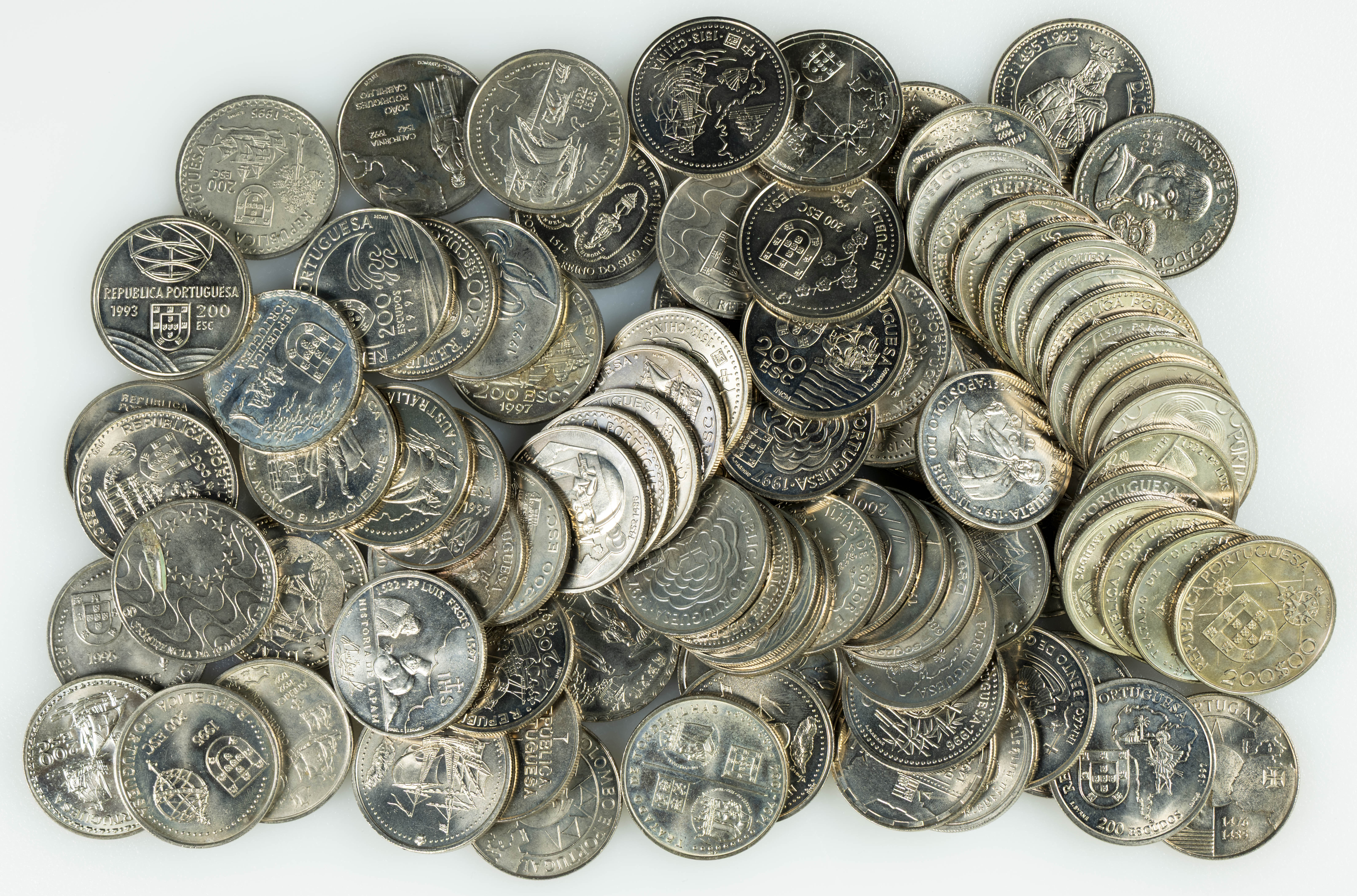 PORTUGAL. Conjunto de 88 monedas de 200 Escudos acuñados en la década de los 90 del siglo pasado. Gran variedad de tipos con el denominador común de una alta calidad de conservación de todas las piezas. A EXAMINAR.