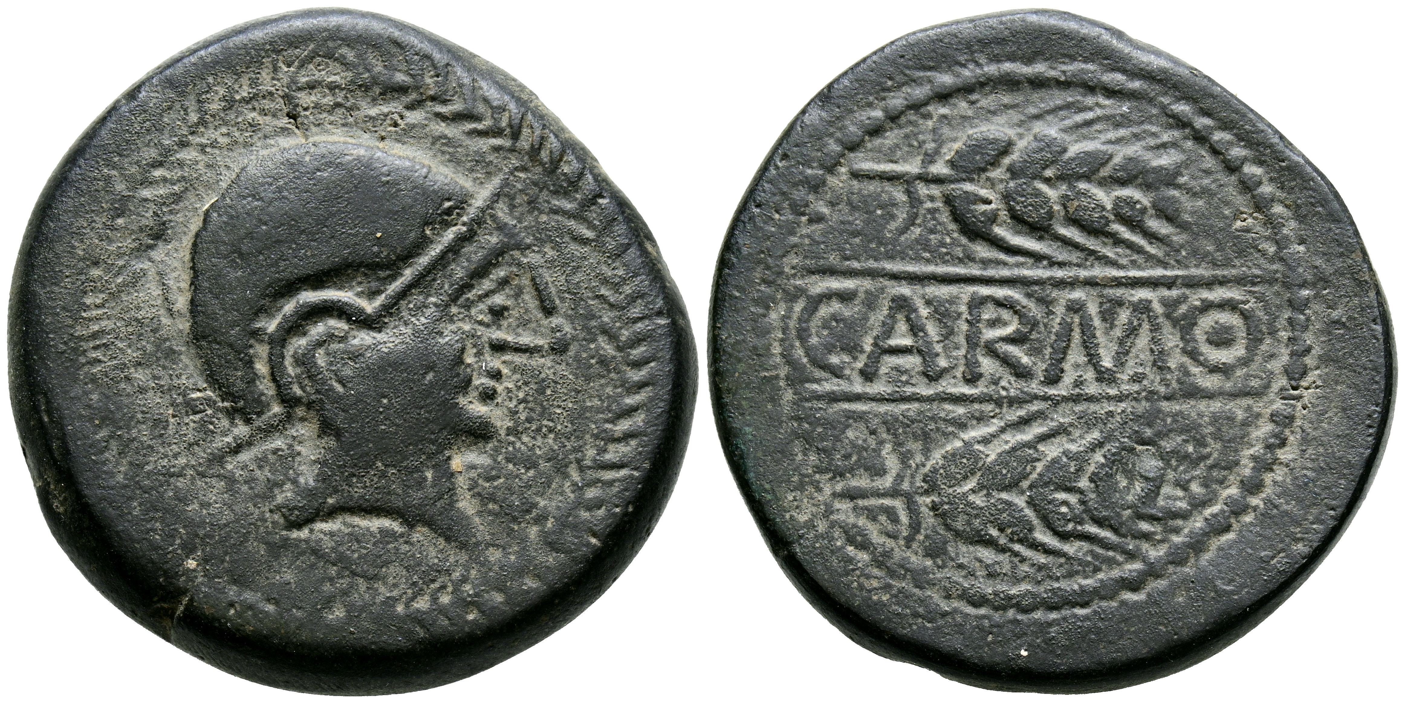 CARMO (Carmona, Sevilla). As. (Ae. 25,63g/33mm). 80 a.C. (FAB-454). Anv: Cabeza masculina con casco a derecha, dentro de corona de laurel. Rev: Dos espigas a derecha, entre ellas leyenda: CARMO. MBC. Repasado y repatinado.