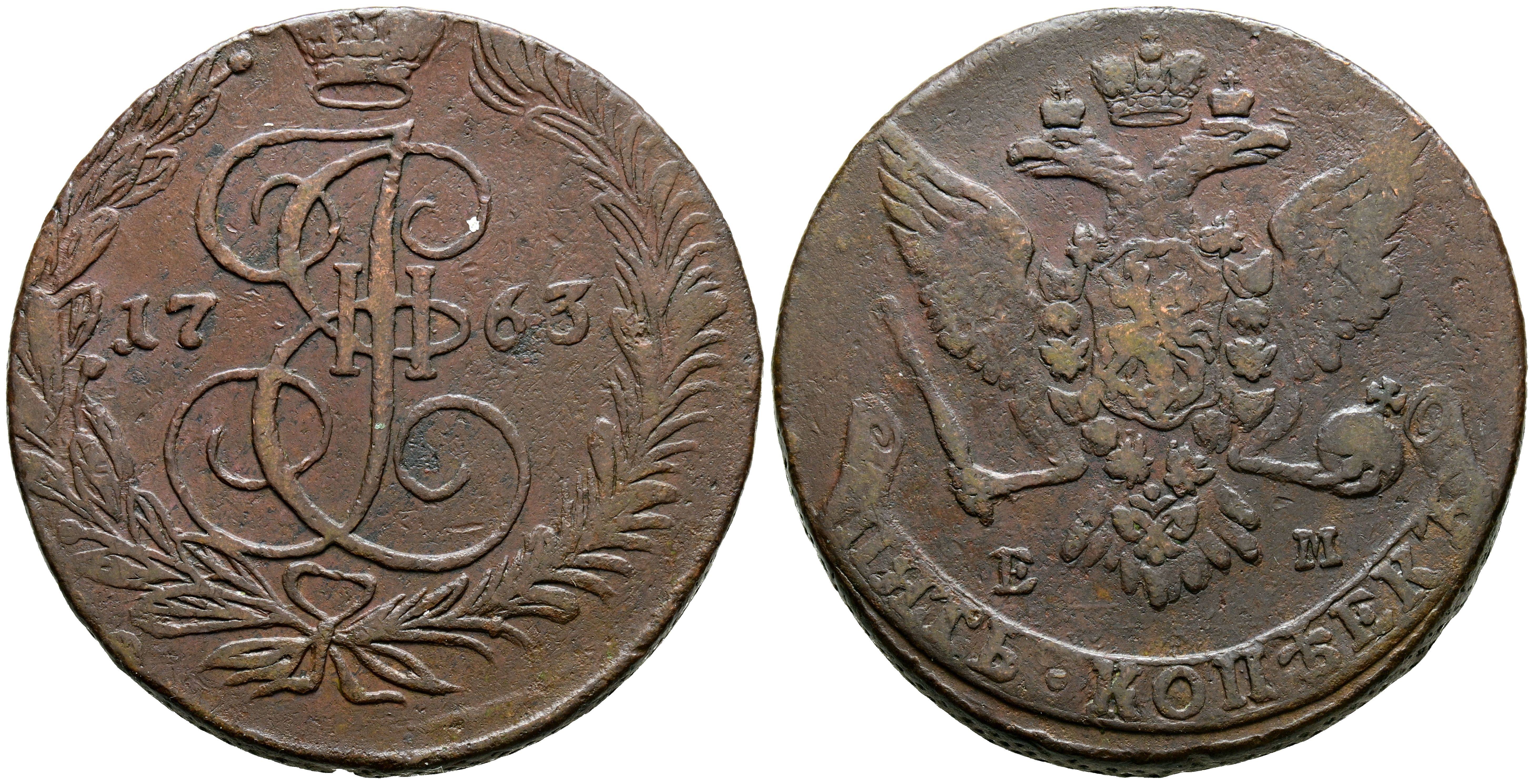 RUSIA, Catalina II (1762-1796). 5 Kopeks. (Ae. 41,06g/41mm). 1763. Ekaterinburgo EM. (Km#C59). MBC.