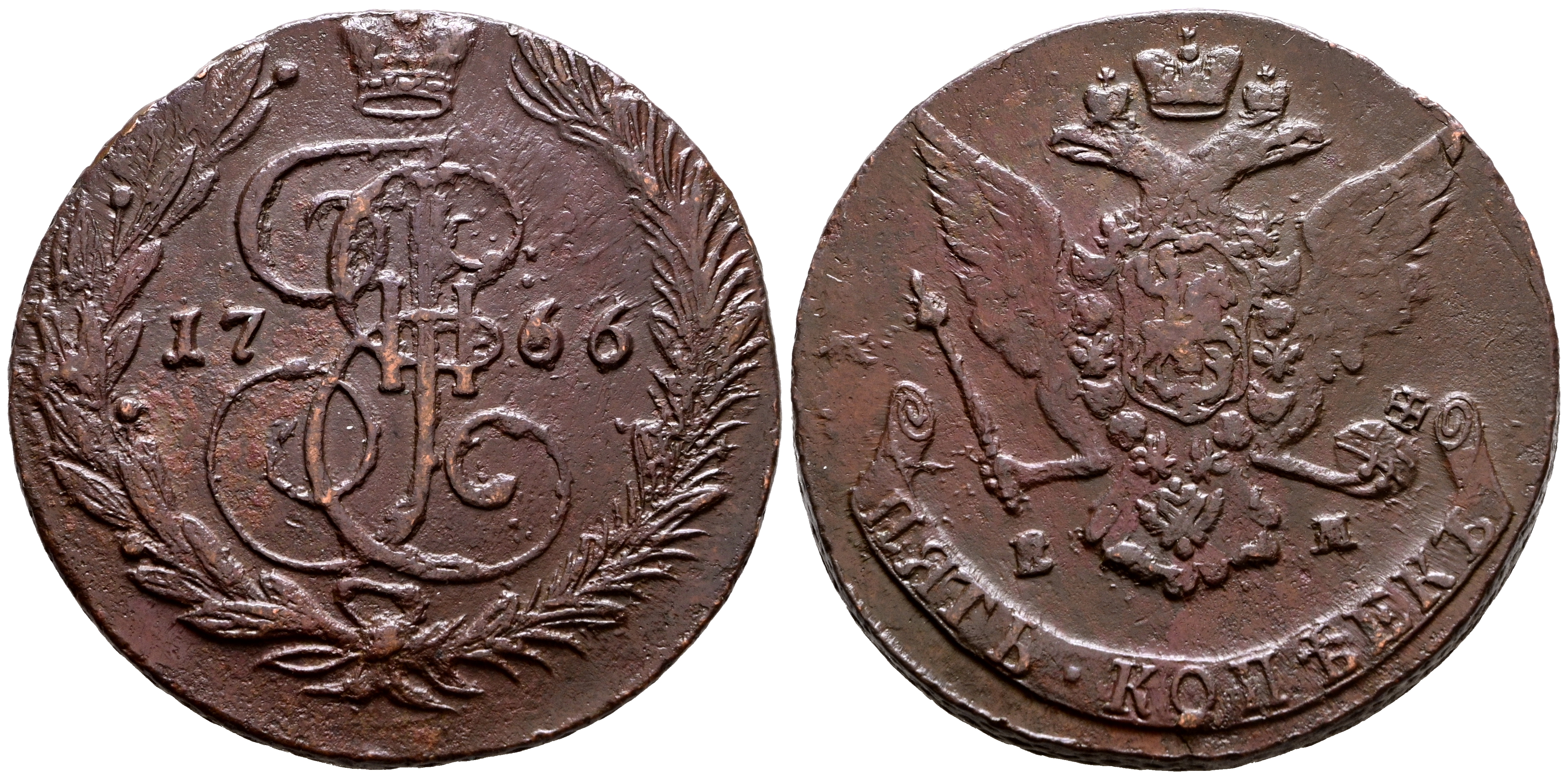 RUSIA, Catalina II (1762-1796). 5 Kopeks. (Ae. 47,09g/42mm). 1766. Ekaterinburgo EM. (Km#C59). MBC+.