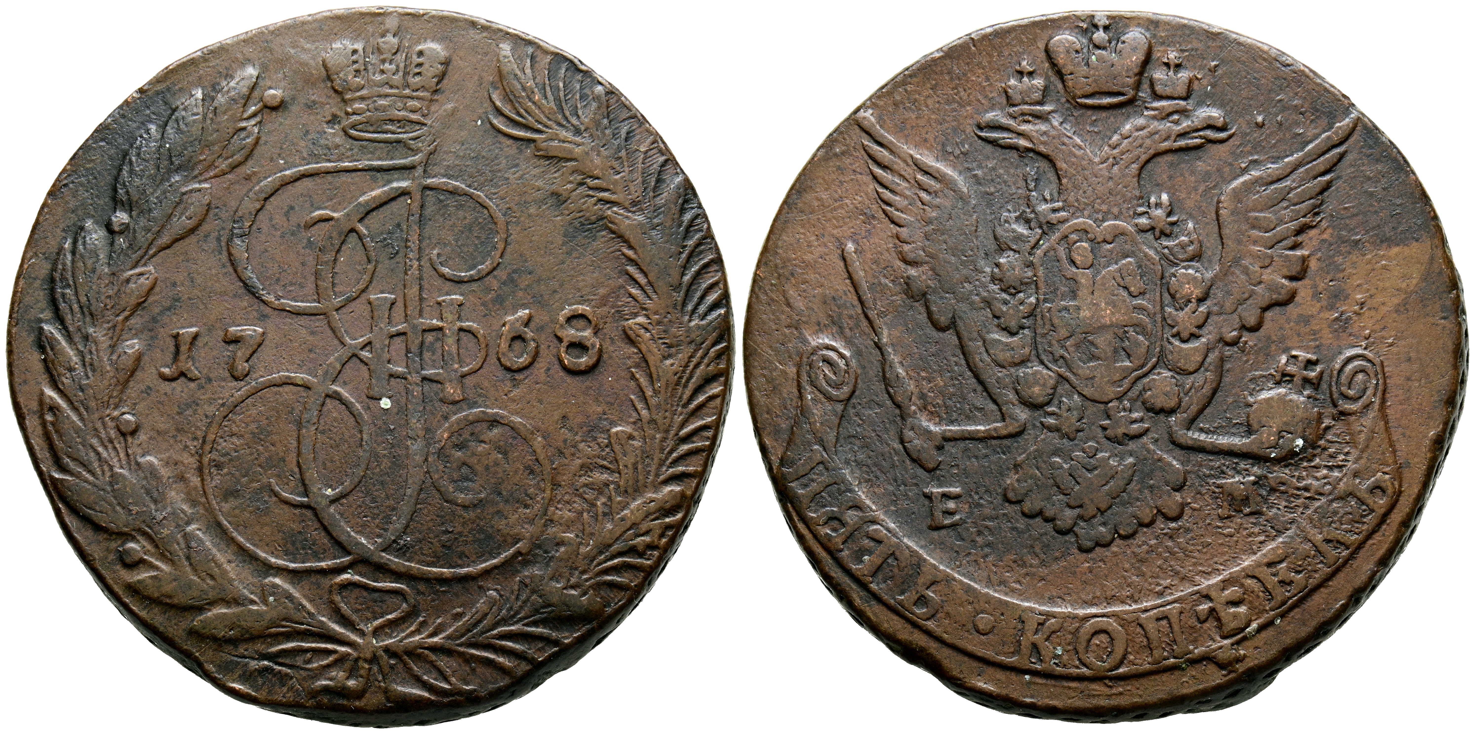 RUSIA, Catalina II (1762-1796). 5 Kopeks. (Ae. 45,93g/42mm). 1768. Ekaterinburgo EM. (Km#C59). MBC.