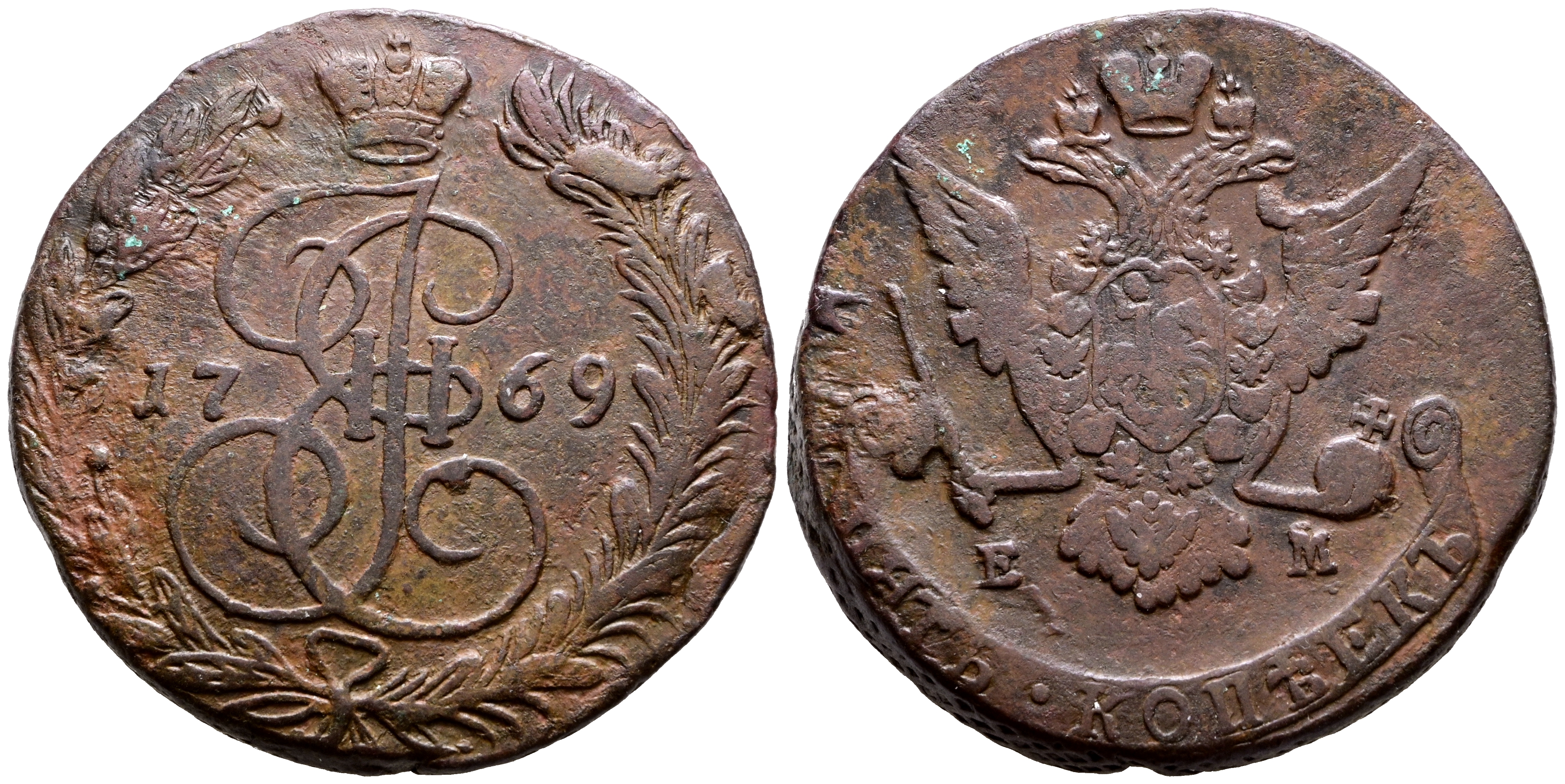 RUSIA, Catalina II (1762-1796). 5 Kopeks. (Ae. 52,81g/42mm). 1769. Ekaterinburgo EM. (Km#C59). MBC+.
