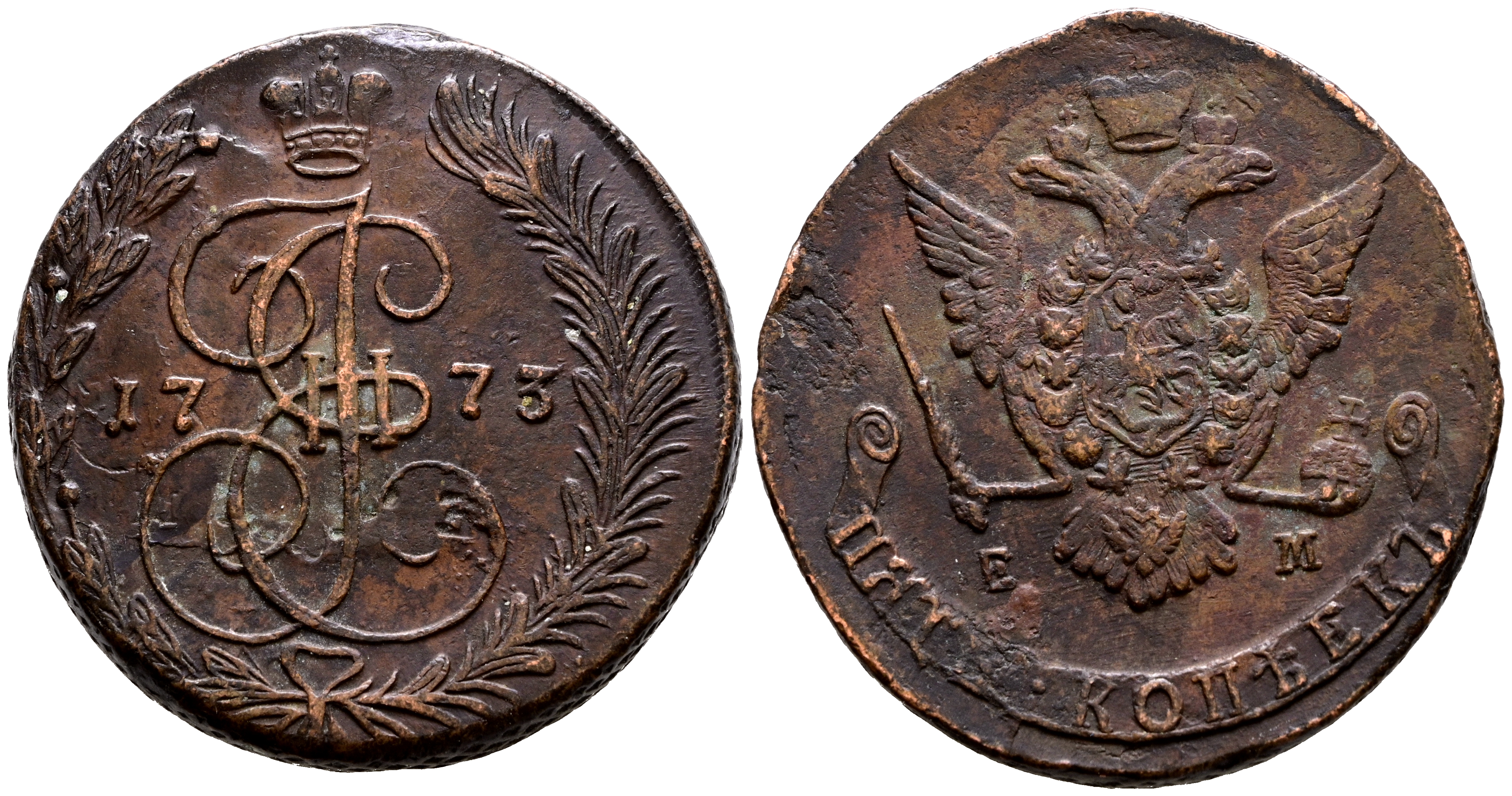 RUSIA, Catalina II (1762-1796). 5 Kopeks. (Ae. 56,88g/43mm). 1773. Ekaterinburgo EM. (Km#C59). MBC.