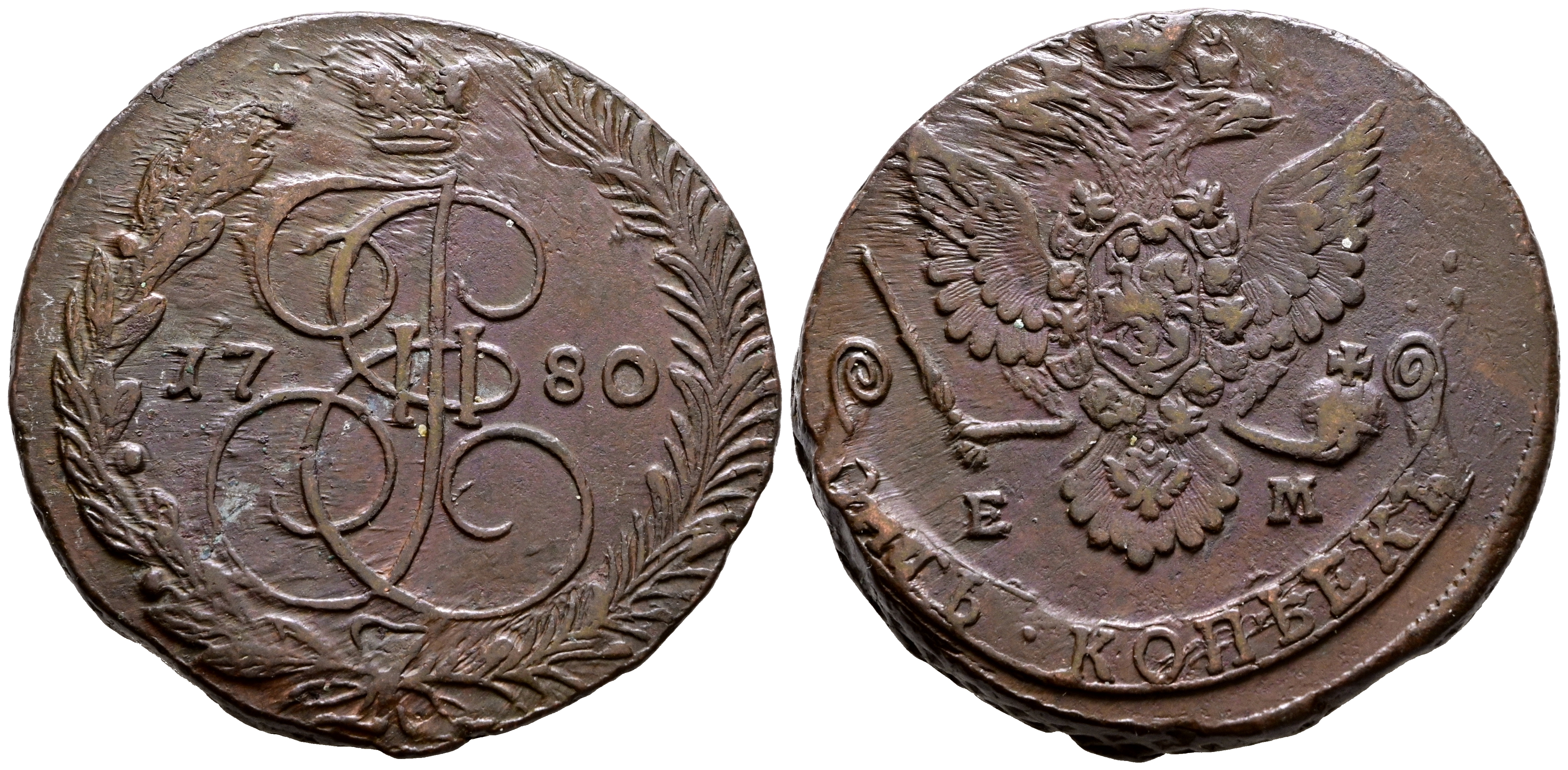 RUSIA, Catalina II (1762-1796). 5 Kopeks. (Ae. 43,11g/43mm). 1780. Ekaterinburgo EM. (Km#C59). MBC+.