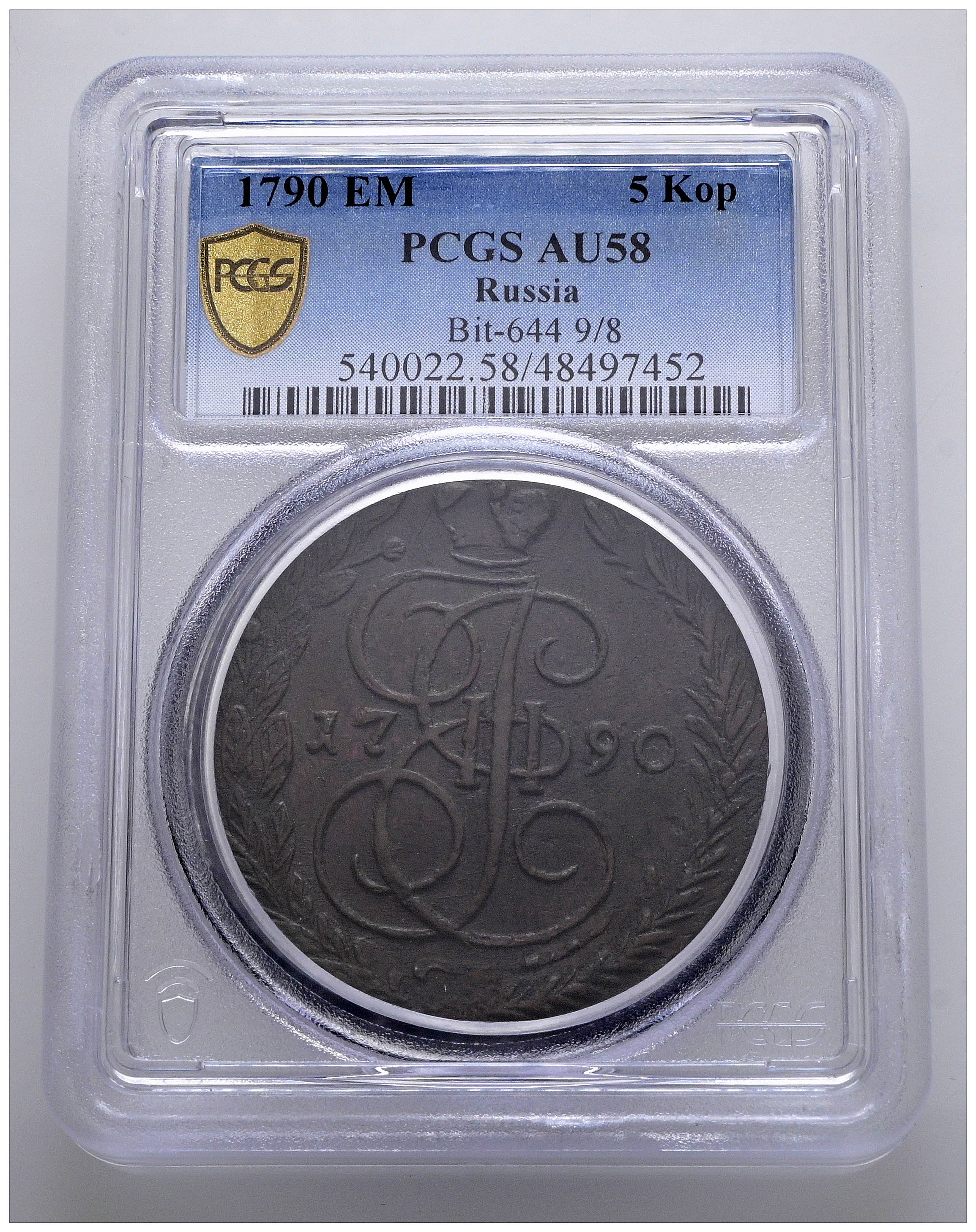 RUSIA, Catalina II (1762-1796). 5 Kopeks. (Ae. 51,19g/42mm)*. 1790. Ekaterinburgo EM. (Km#C59). Encapsulada por PCGS AU 58. *Peso y medidas teóricos.