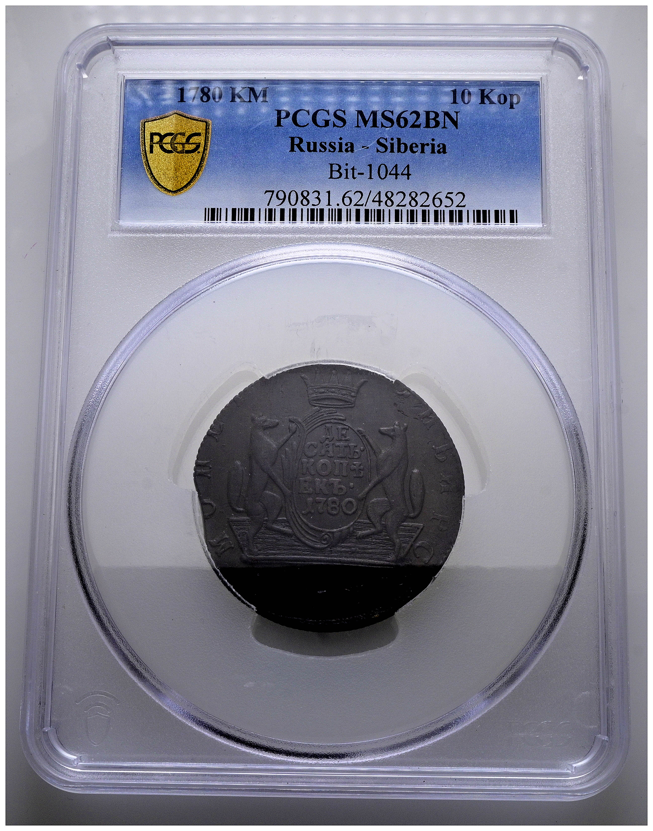RUSIA, Catalina II (1762-1796). 10 Kopeks. (Ae. 65,50g/45mm)*. 1780. Suzun KM (Siberia). (Km#C6). Encapsulada por PCGS MS 62 BN. Escasa. *Peso y medidas teóricos.