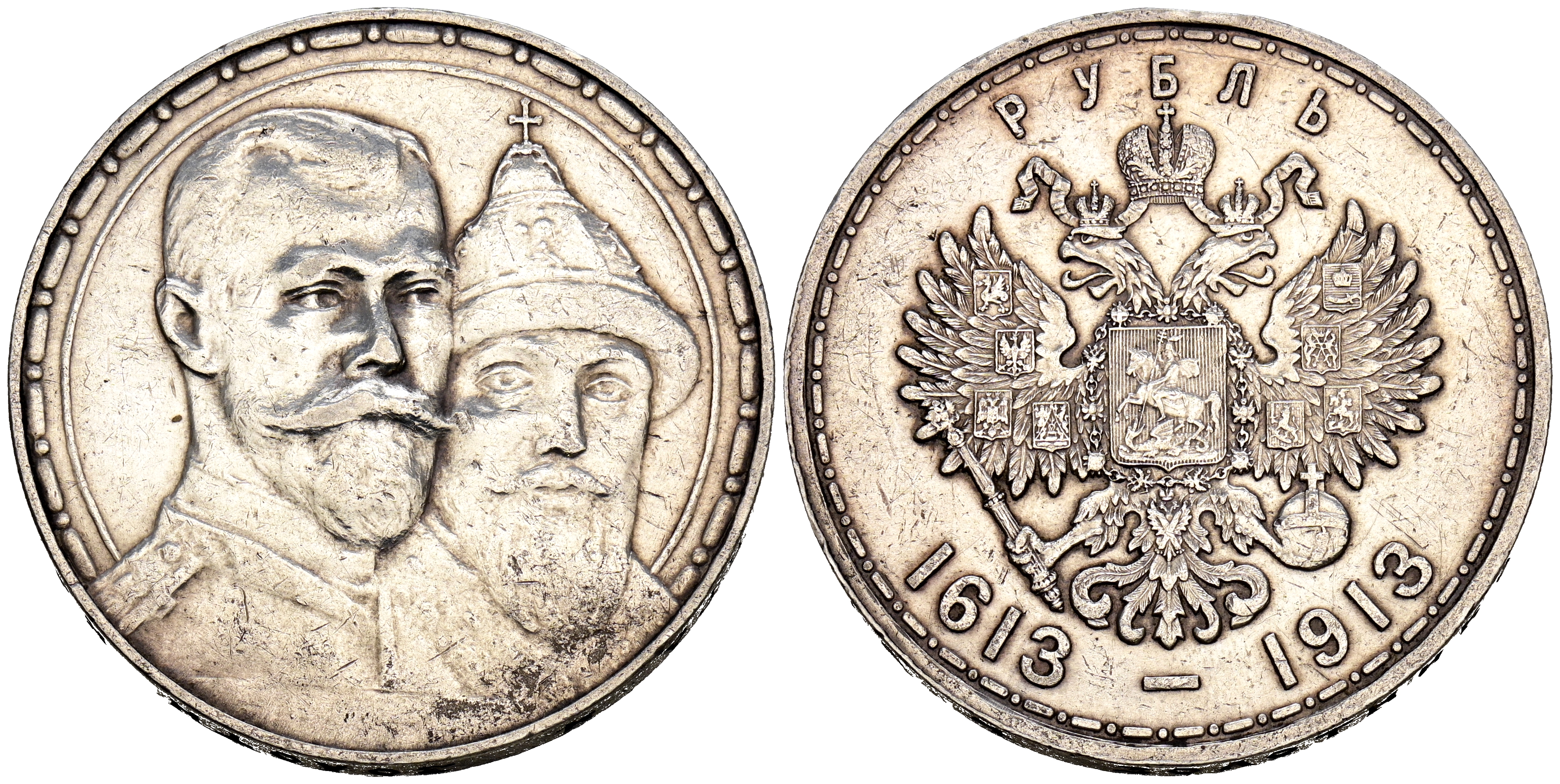 RUSIA, Nicolas II. 1 Rublo. (Ar. 19,87g/34mm). 1913. San Petersburgo. 300º Aniversario de la Dinastía Romanov. (Km#70). MBC+. Limpiada. Escasa.
