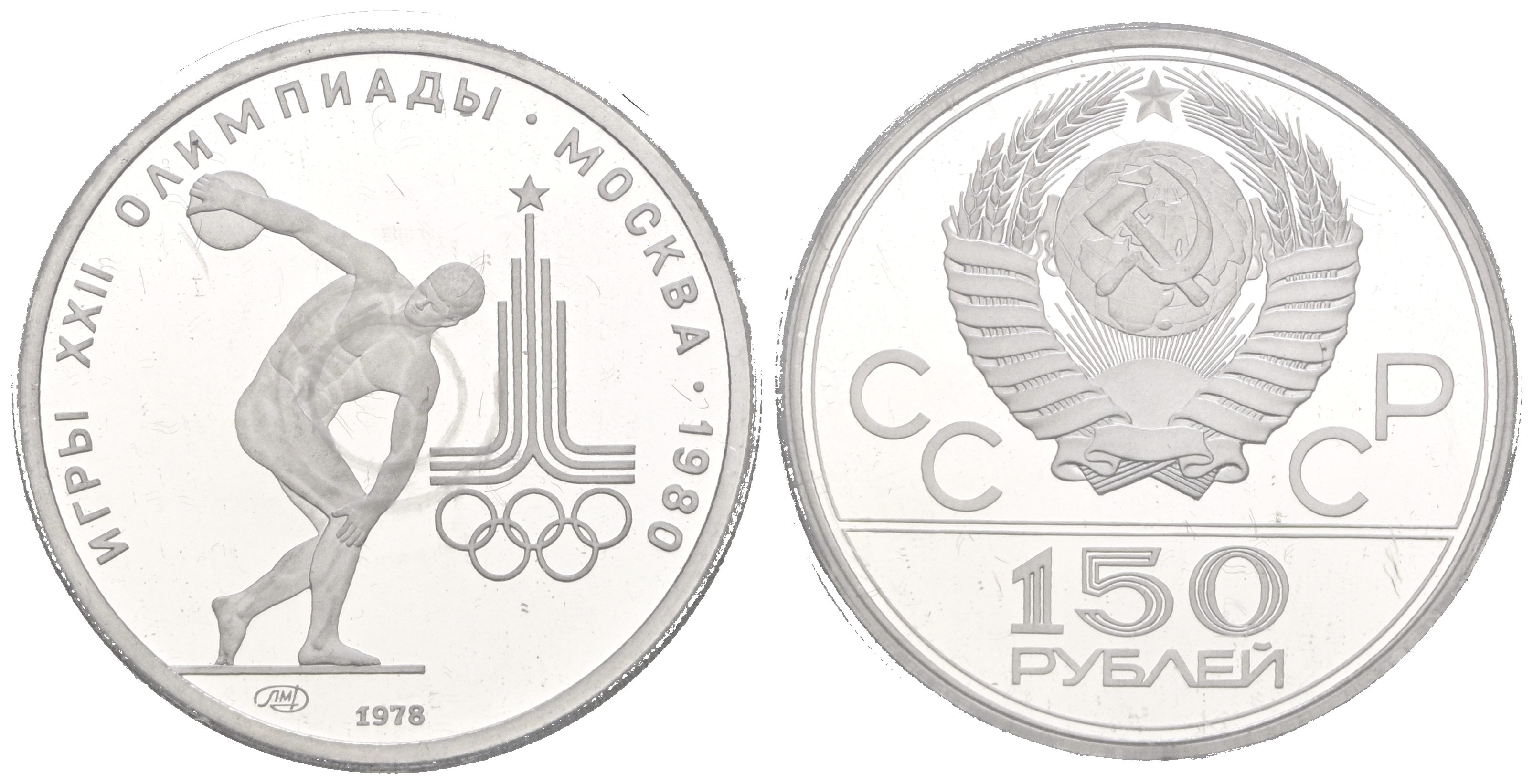 RUSIA. 150 Rublos. (Pt. 15,63g/28mm). 1980. Juegos Olímpicos Moscú 1980. Discóbolo. (Km#163). SC.