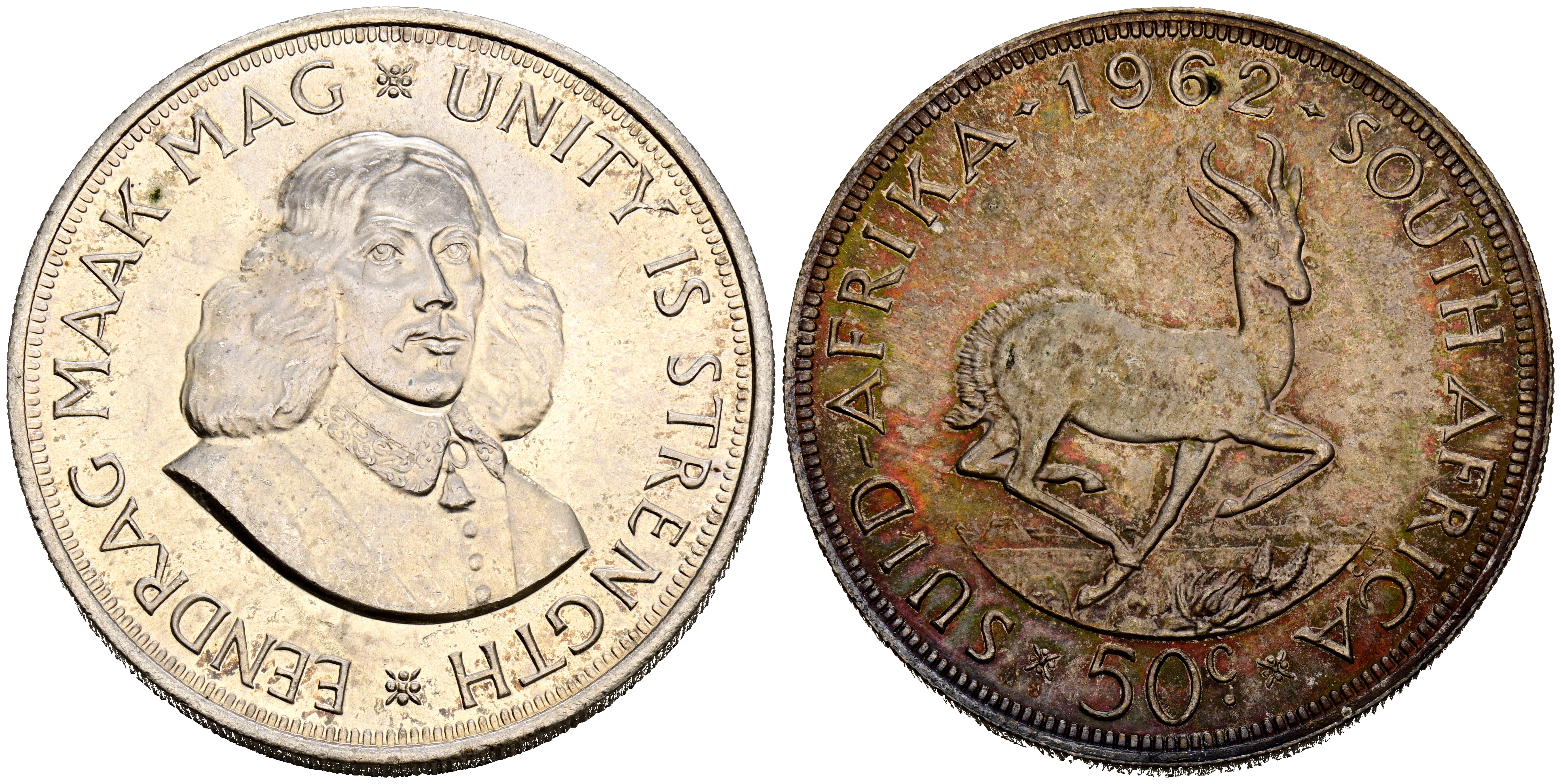 SUDÁFRICA. 50 Cents. (Ar. 28,21g/39mm). 1962. Jan Van Riebeeck. (Km#62). SC-. Pátina dorada en reverso.
