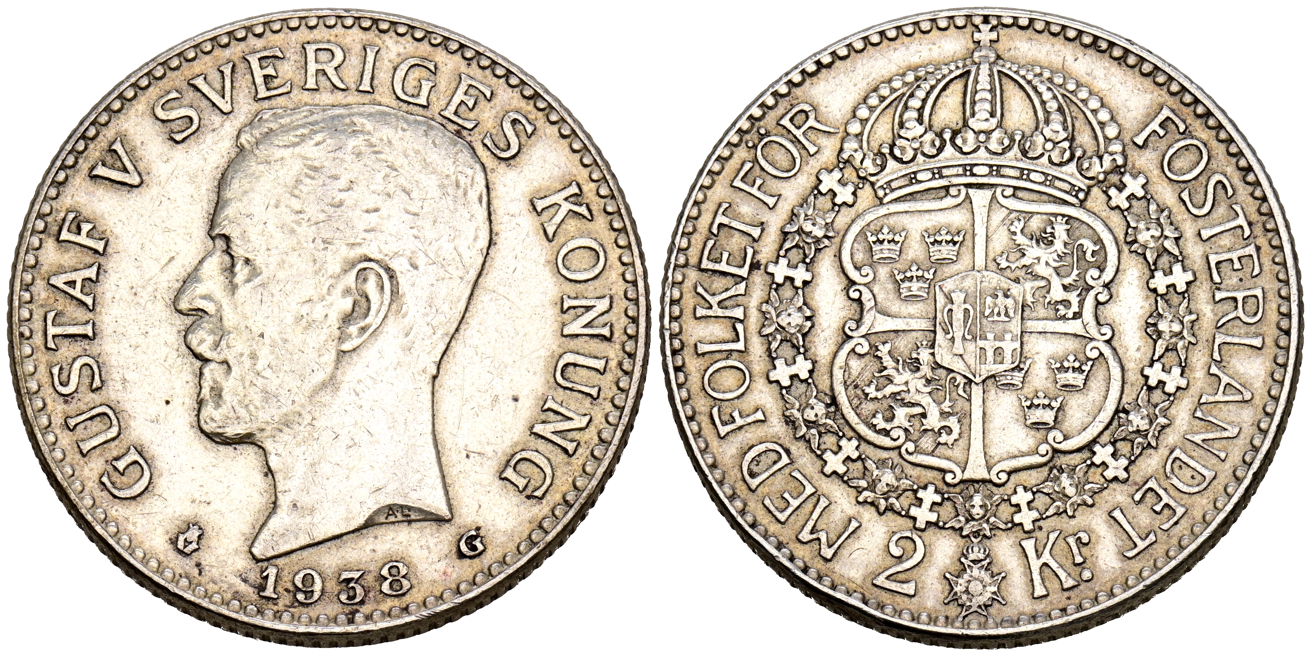 SUECIA, Gustaf V. 2 Coronas. (Ar. 15,04g/31mm). 1938. (Km#787). MBC+.