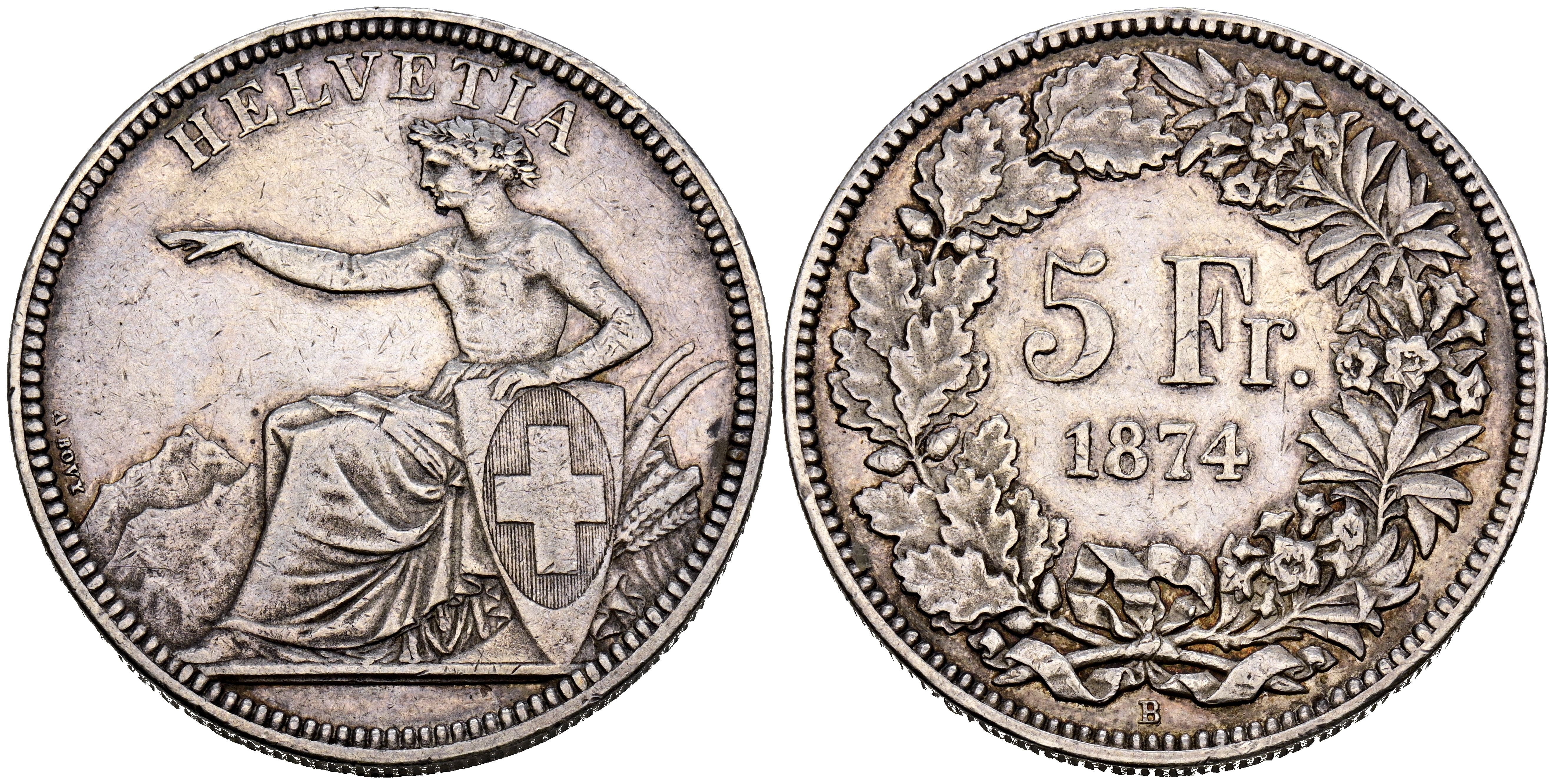 SUIZA. 5 Francs. (Ar. 24,92g/37mm). 1874. Berna B. Helvetia sentada. (Km#11). MBC. Escasa. Último año de acuñación de la serie de Helvetia sentada (1850 a 1874) que ha quedado como símbolo de la Confederación Suiza tras la Constitución de 1848.