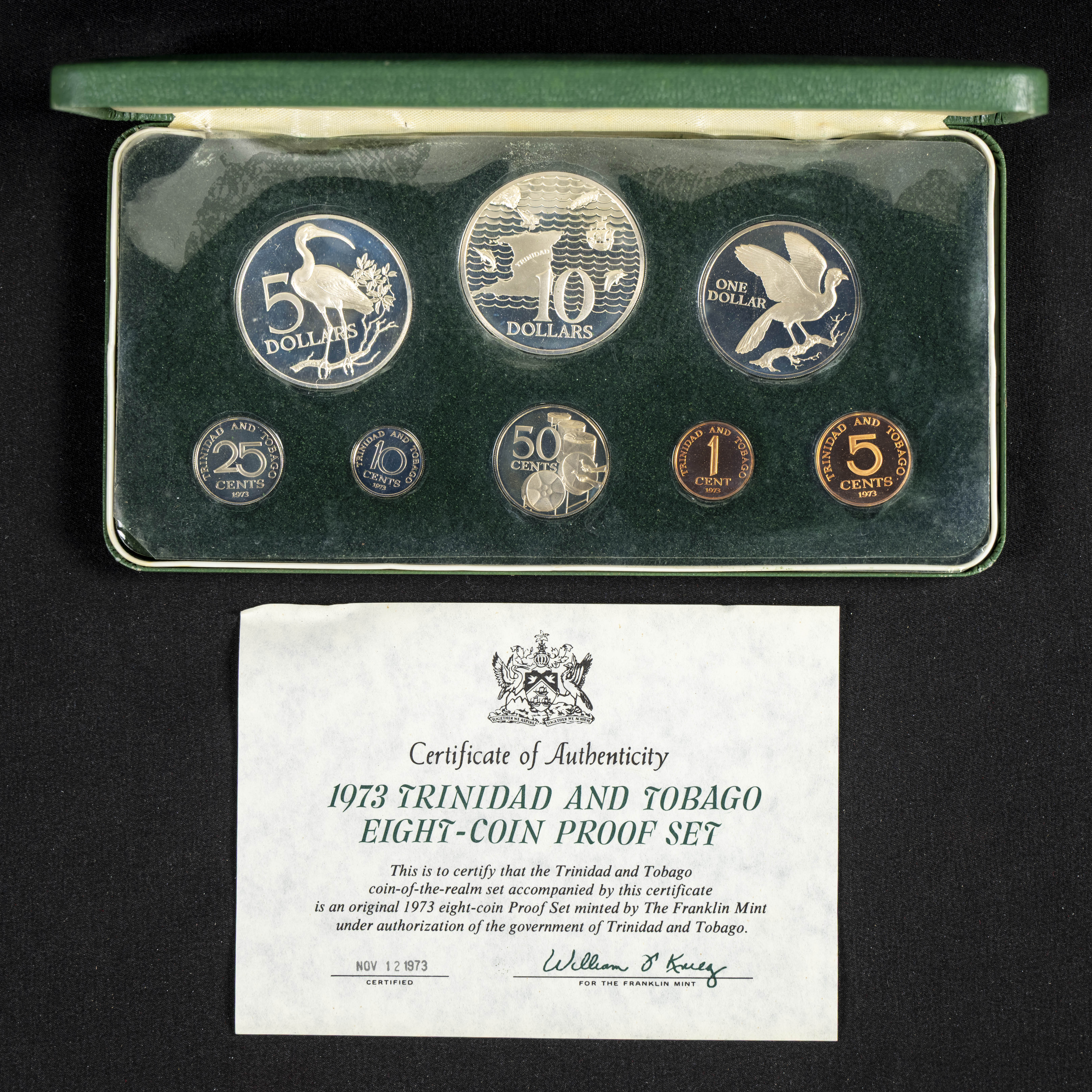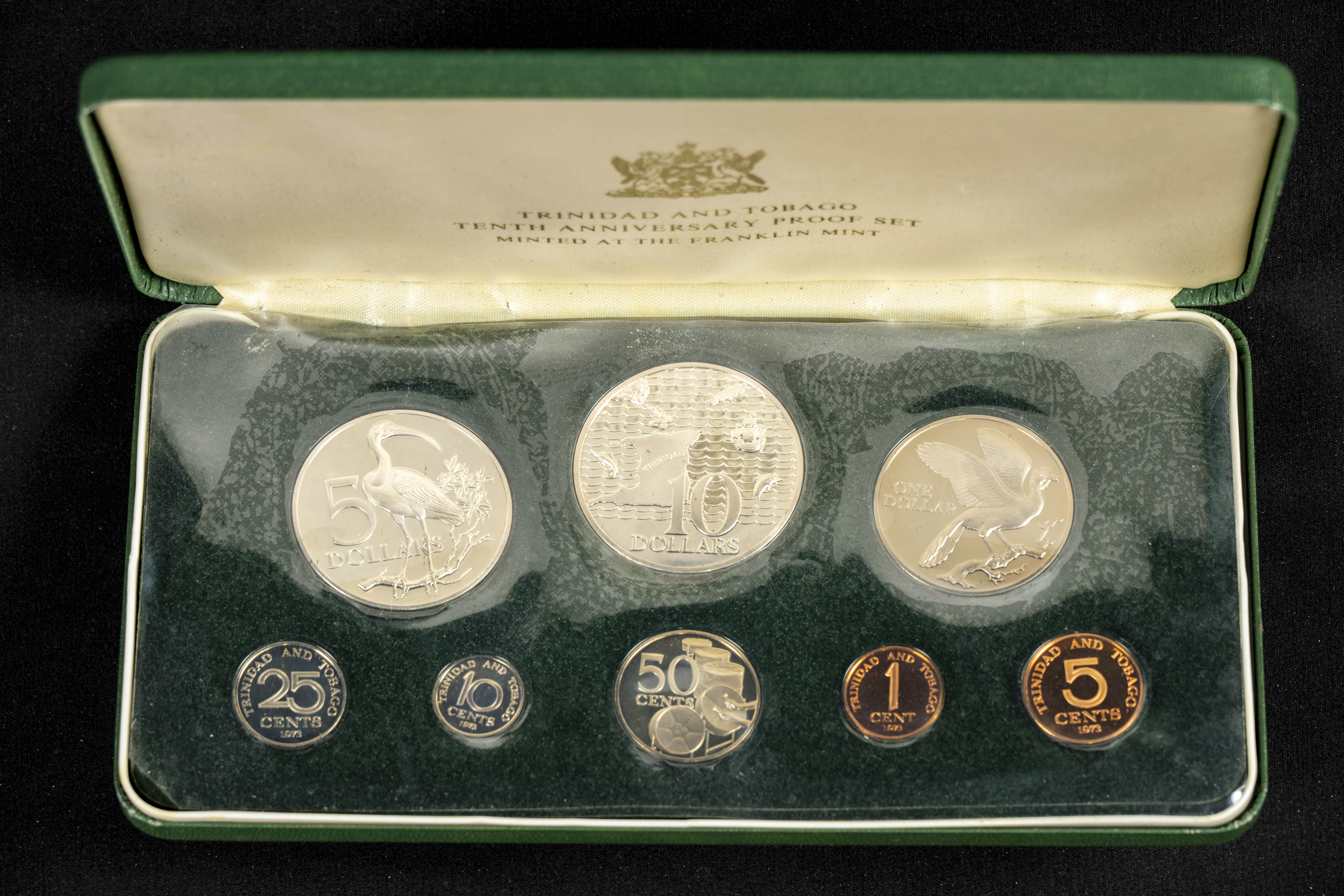 TRINIDAD Y TOBAGO. Set completo compuesto por 8 monedas con valores comprendidos entre 1 Cent y 10 Dollars. 1973. Diferentes materiales de acuñación incluyendo la plata. PROOF. Incluye estuche original (monedas en blister sin sacar) y certificado de autenticidad.