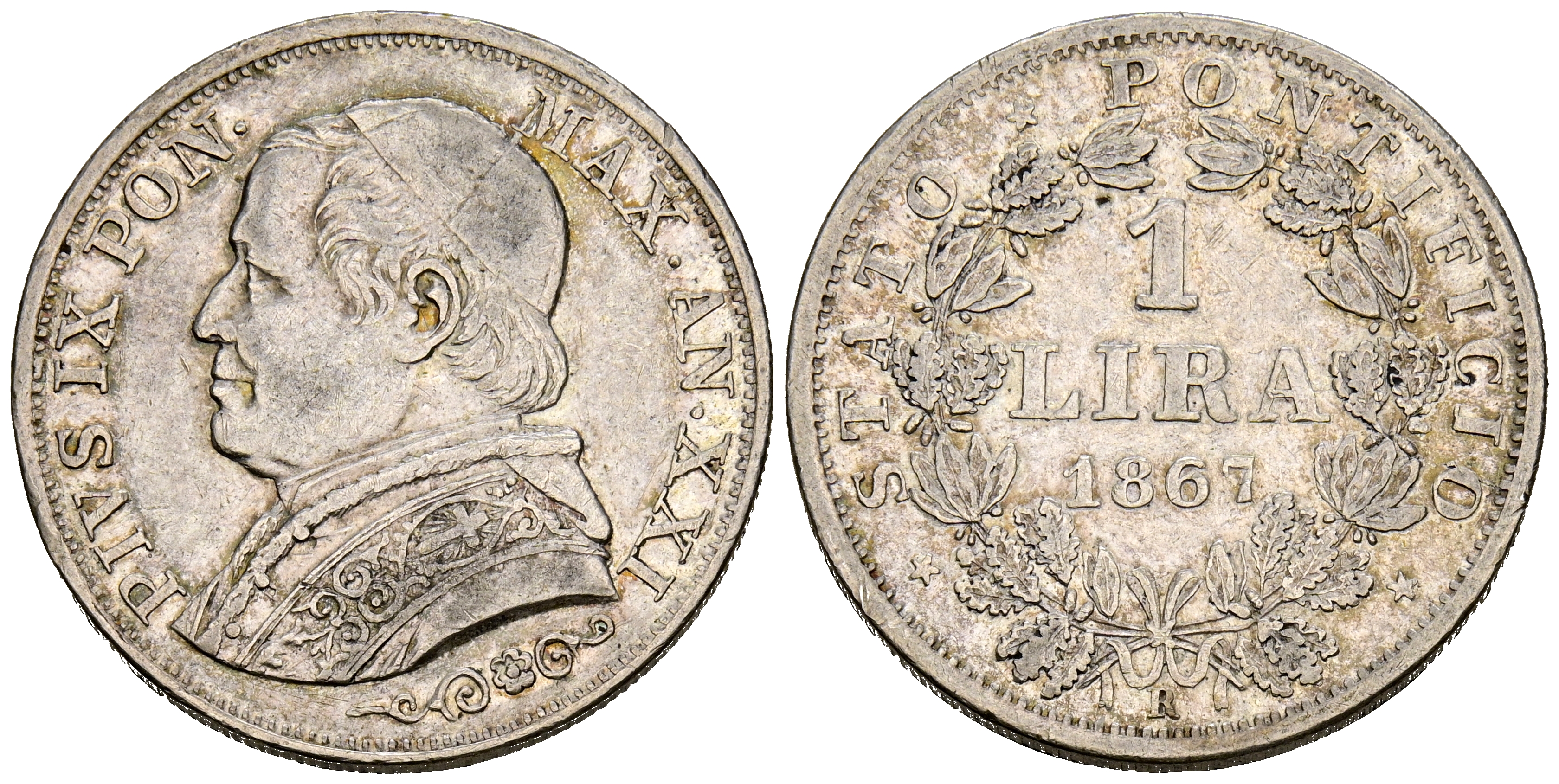 VATICANO, Pío IX. 1 Lira. (Ar. 4,97g/23mm). 1867. (Km#1378). MBC+.