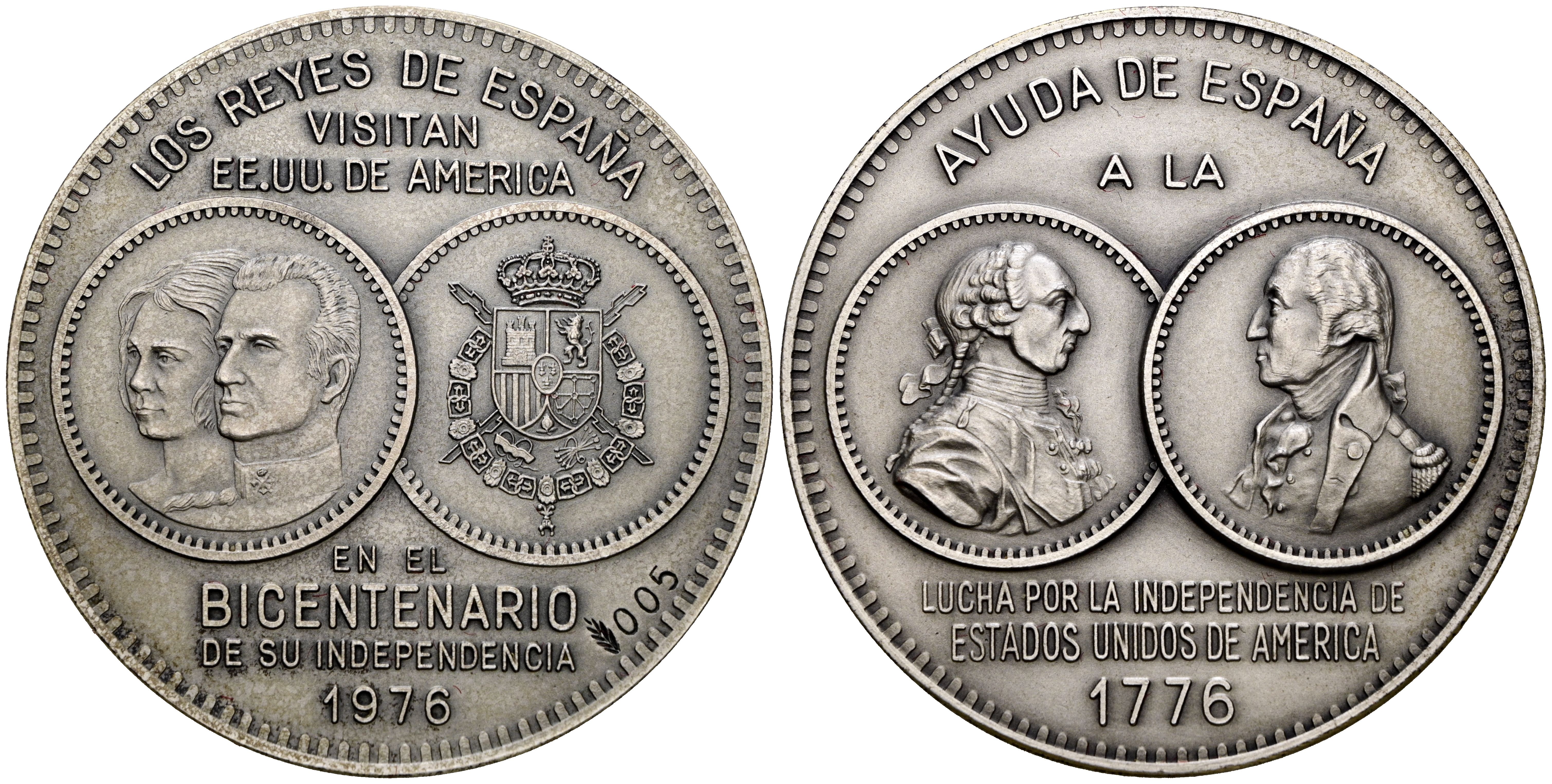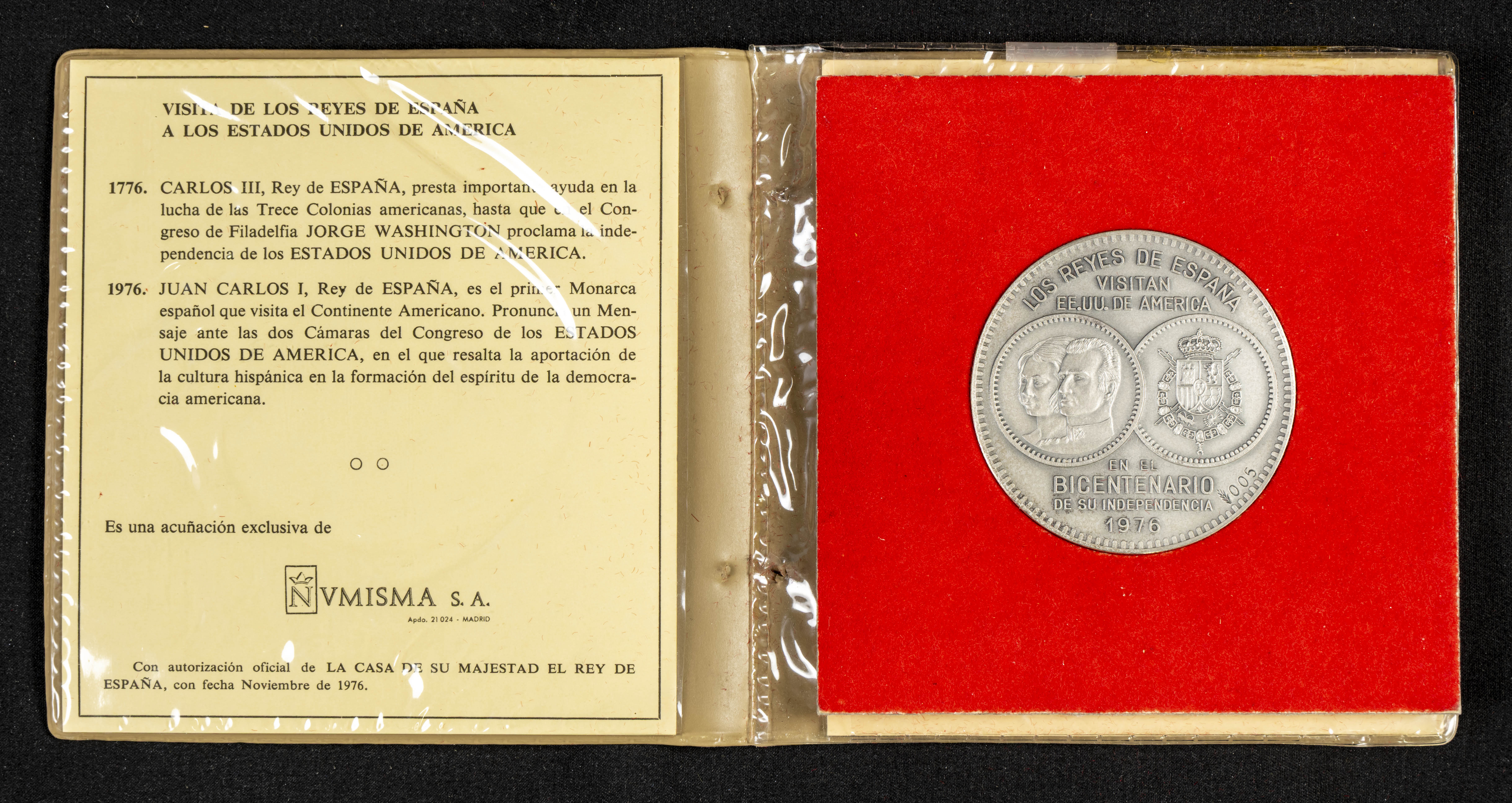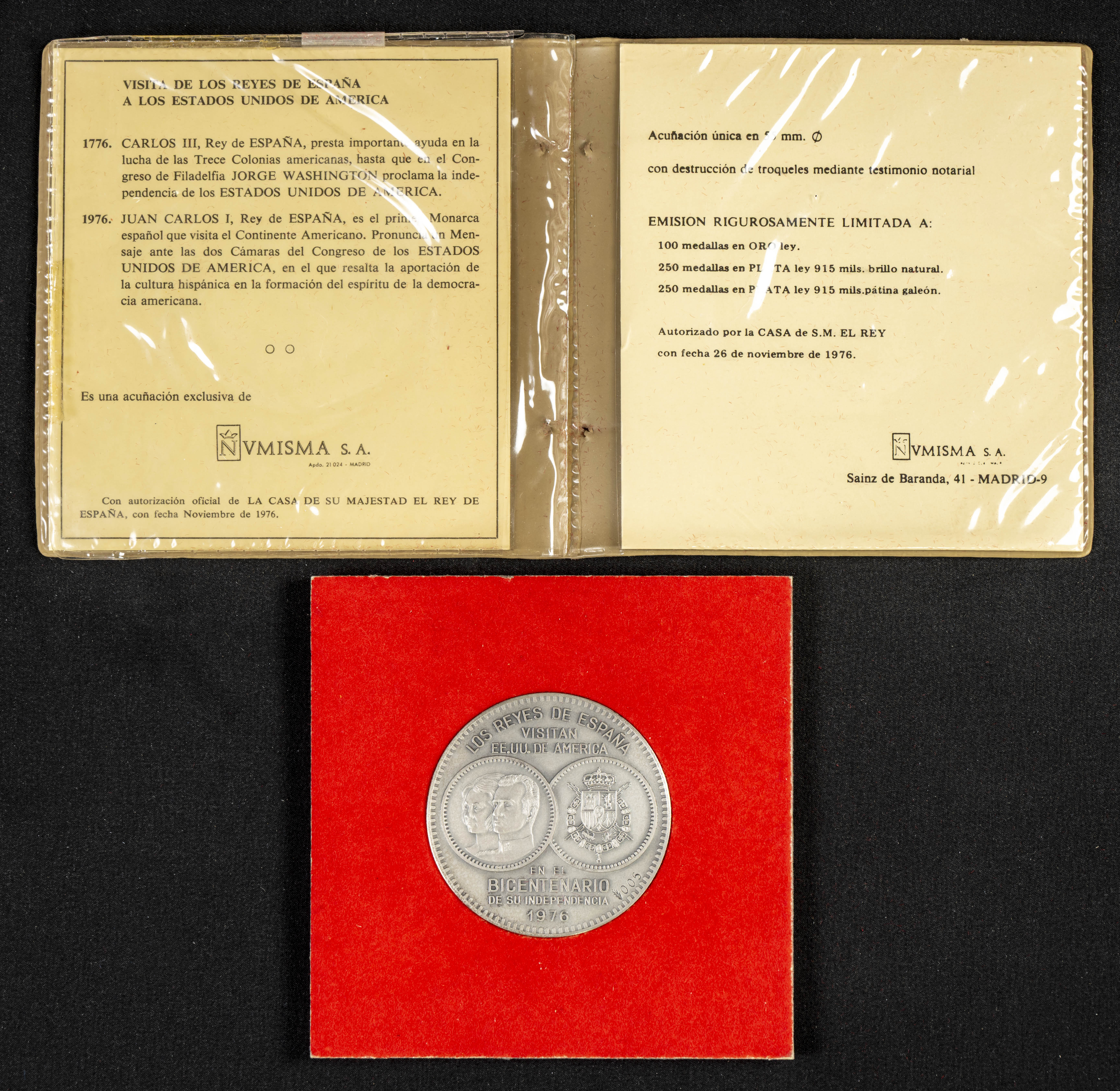 ESPAÑA. Visita de los Reyes de España a Estados Unidos. (Ar. 120,51g/55mm). 1976. Bicentenario de Independencia. Plata de 0,915 milésimas. SC. Acuñada por Numisma. Incluye estuche original.