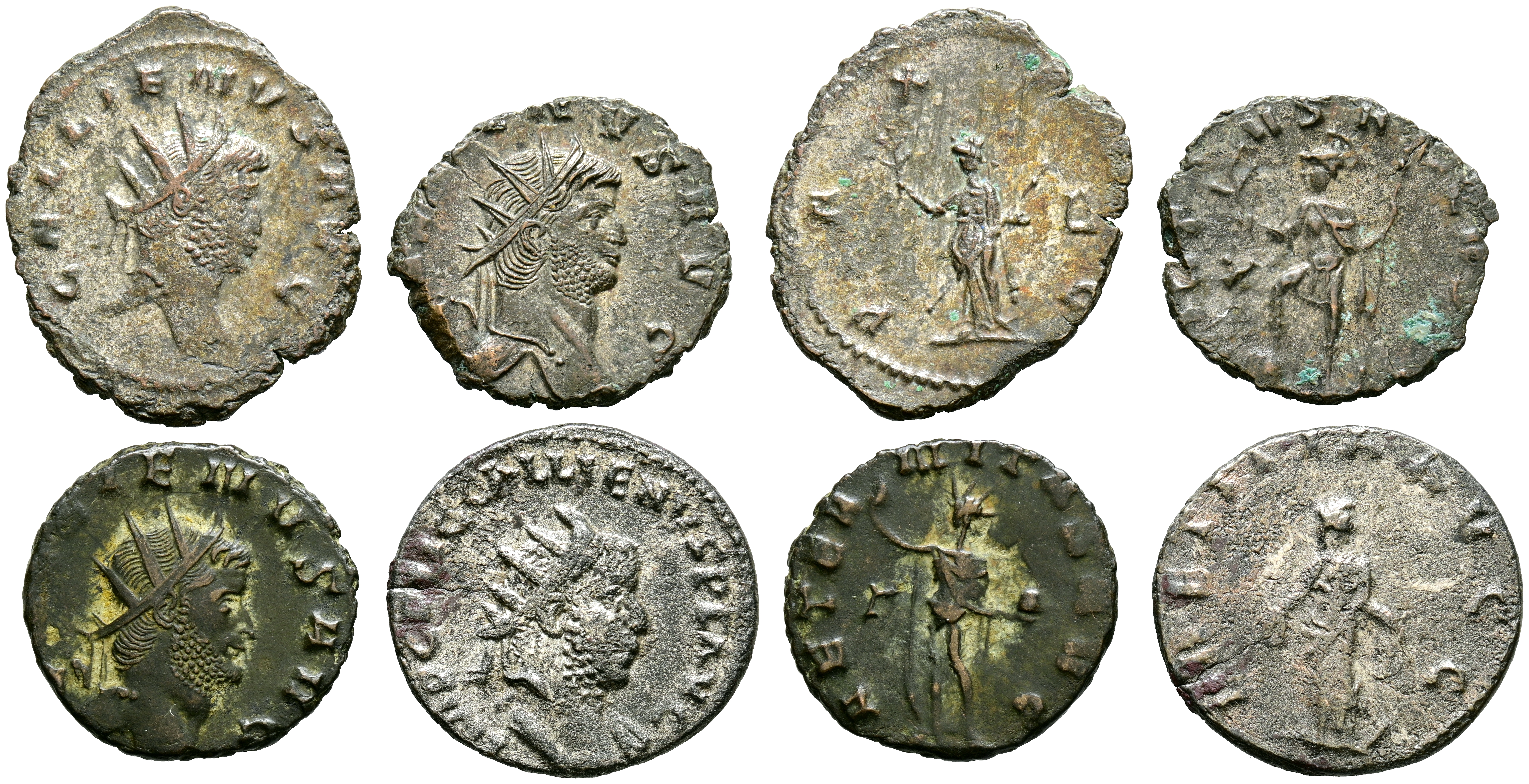 IMPERIO ROMANO. Interesante conjunto formado por 4 antoninianos de Gallieno. Diferentes medidas, reversos y estados de conservación. A EXAMINAR.