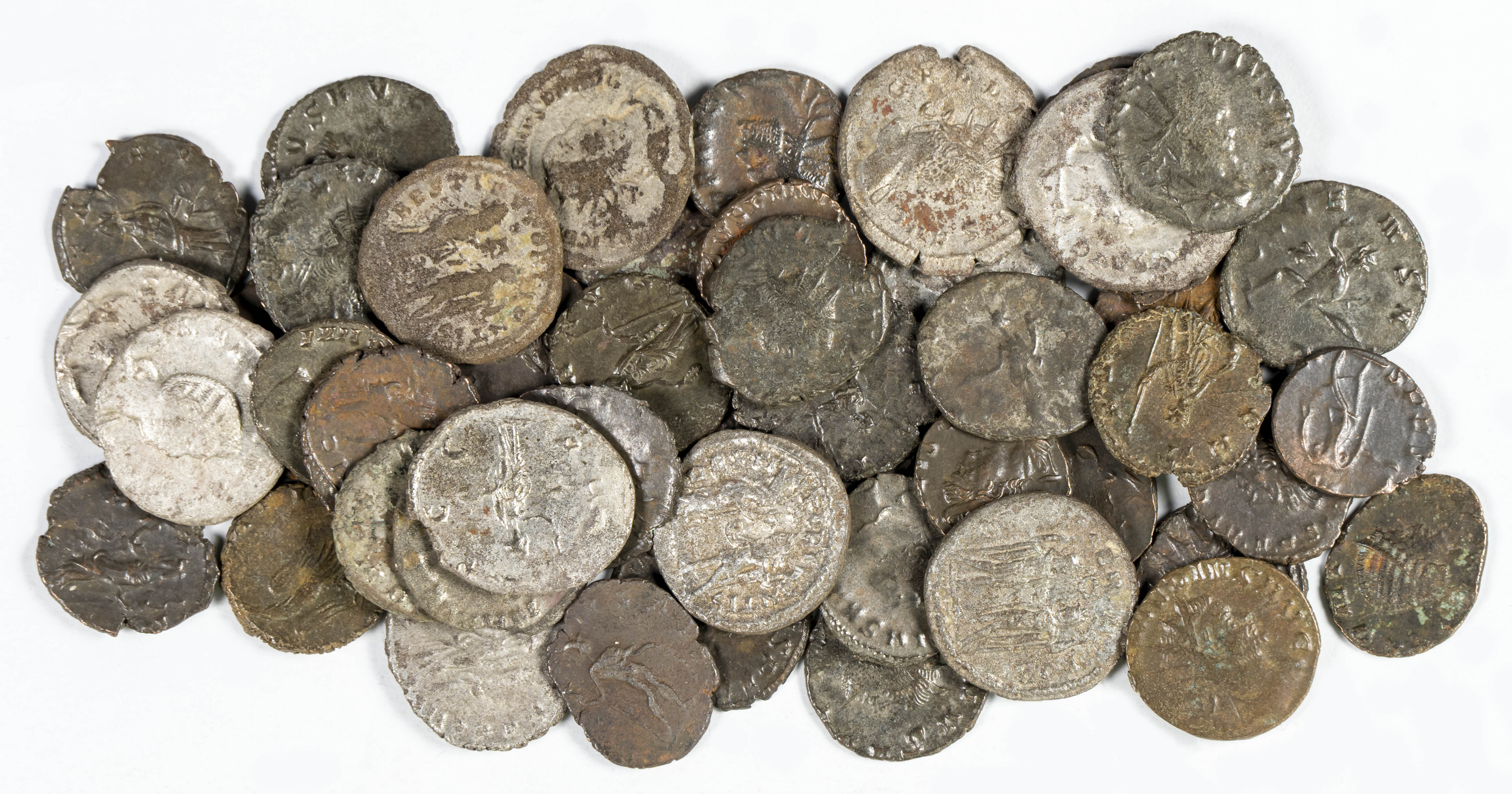 IMPERIO ROMANO. Interesantísimo conjunto formado por 50 Antoninianos correspondientes a Tétrico I (10), Tétrico II (5), Victorino (5), Claudio II (10), Salonina (5), Valeriano I (5) y Galieno (10). Diferentes reversos, medidas y estados de conservación. A EXAMINAR.