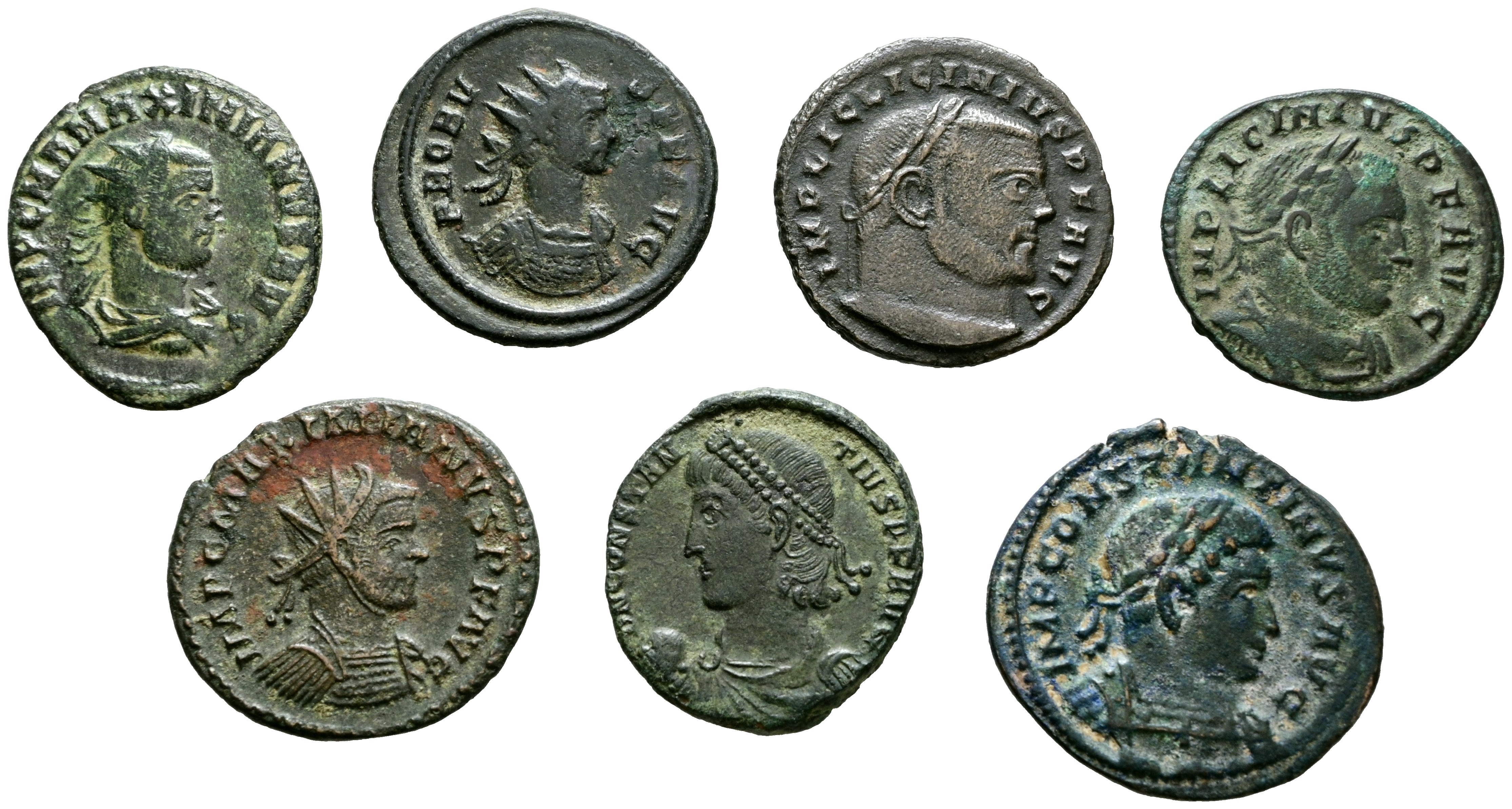 IMPERIO ROMANO. Interesante conjunto formado por 7 acuñaciones bajo imperiales a nombre de Constantino, Licinio, Probo y Maximiano. Diferentes reversos, cecas y estados de conservación. A EXAMINAR.