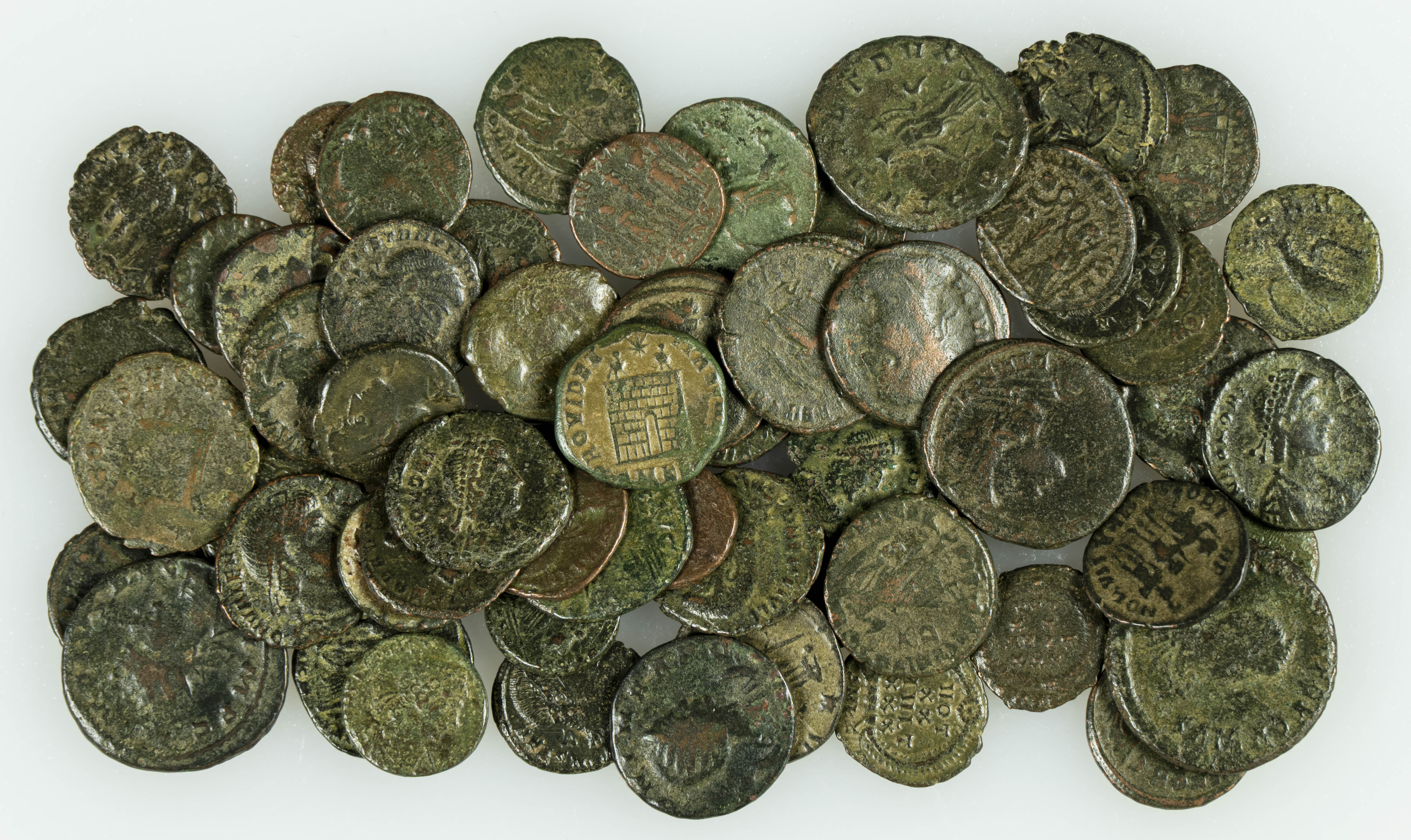 IMPERIO ROMANO. Conjunto de más de 50 monedas del bajo imperio romano de distintos emperadores, reversos y calidades. A EXAMINAR.