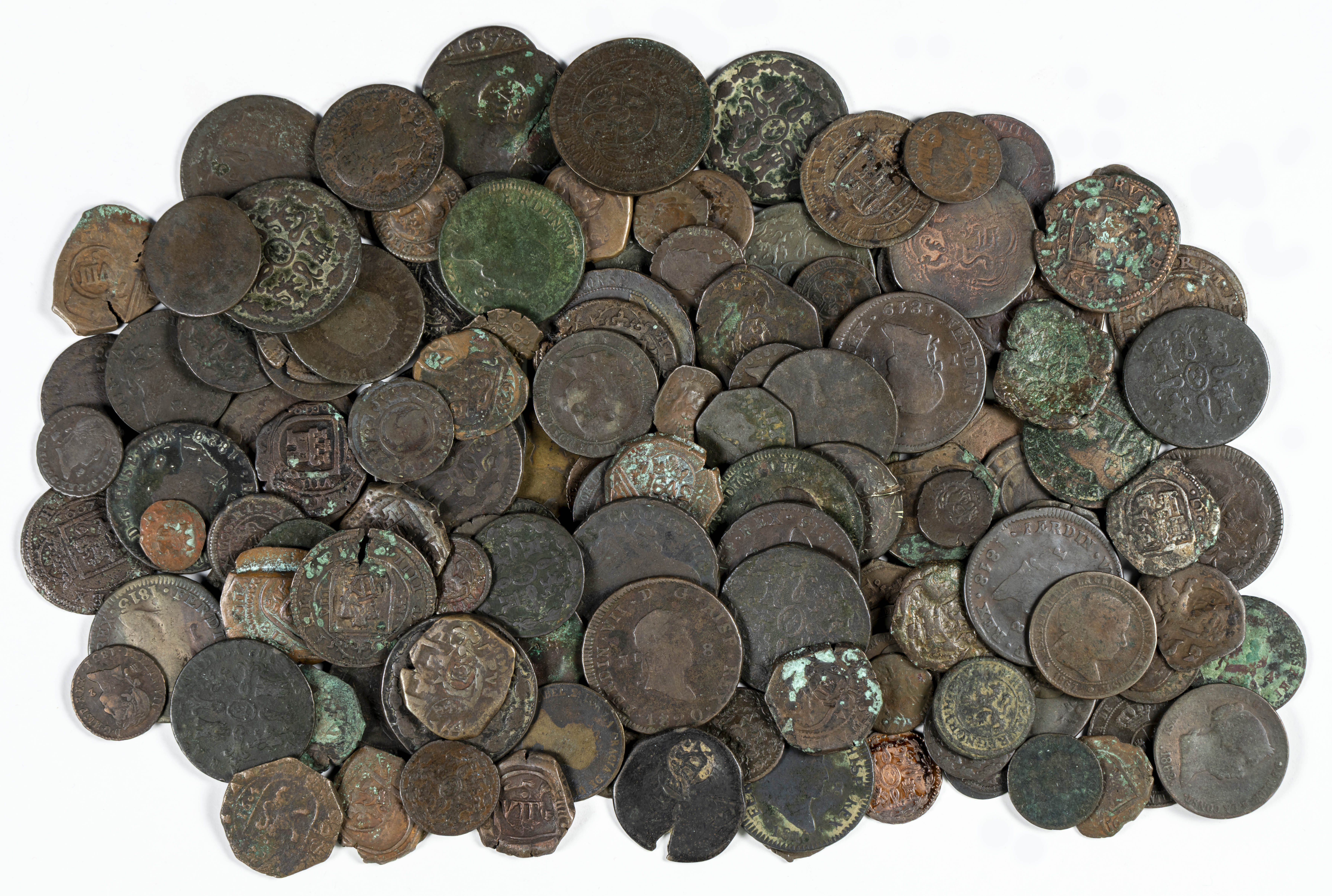 MONARQUÍA ESPAÑOLA. Magnífico conjunto formado por alrededor de 150 cobres acuñados entre los periodos de los RRCC e Isabel II. Variedad de módulos, fechas y cecas así como estados de conservación. Incluye piezas con resellos y alguna falsa de época de interés. A EXAMINAR.