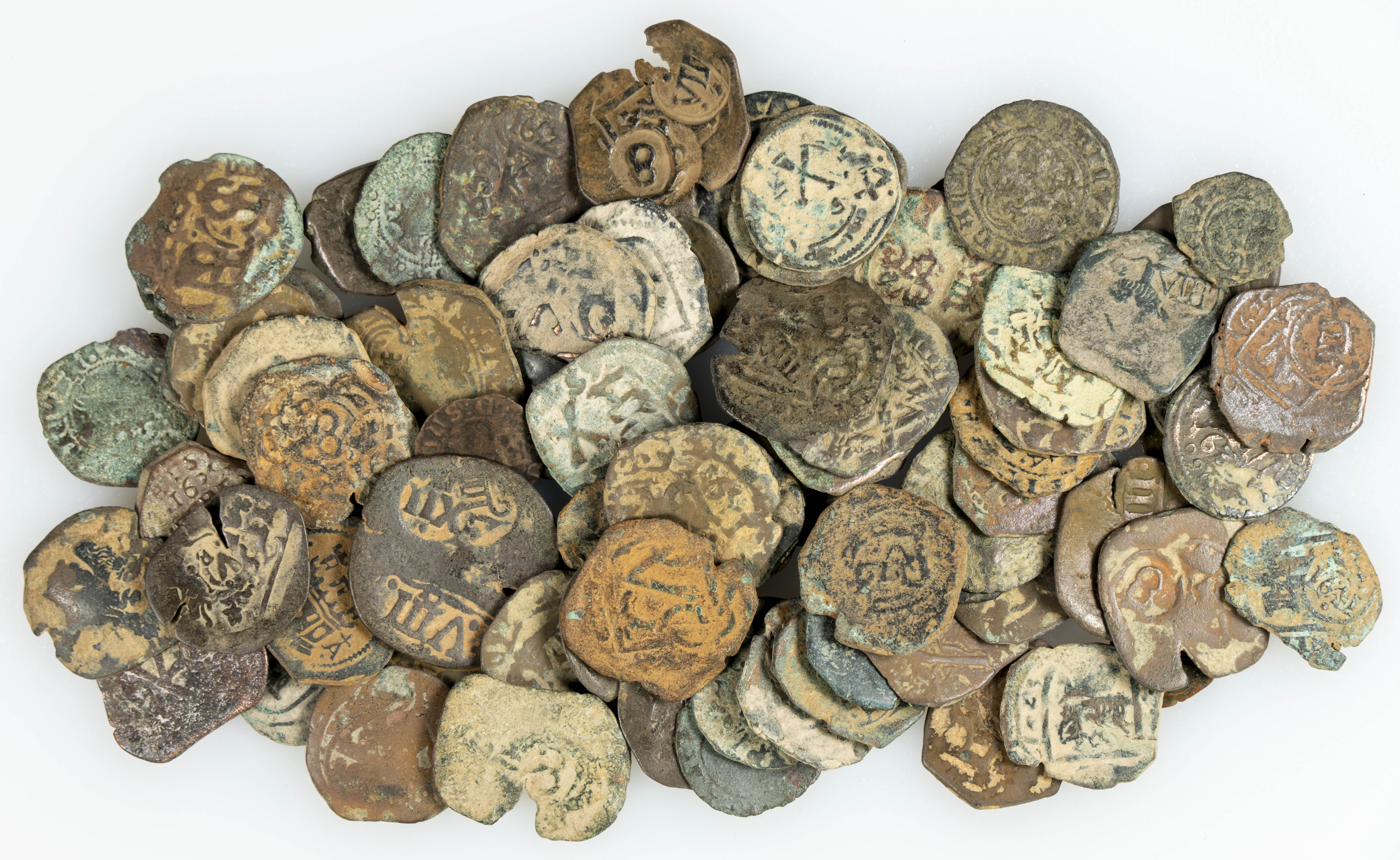 MONARQUIA ESPAÑOLA. Interesantísimo conjunto formado por 77 cobres, en su mayoría del periodo de los Austrias, incluyendo alguna pieza medieval. Diferentes módulos, cecas y estados de conservación. A EXAMINAR.
