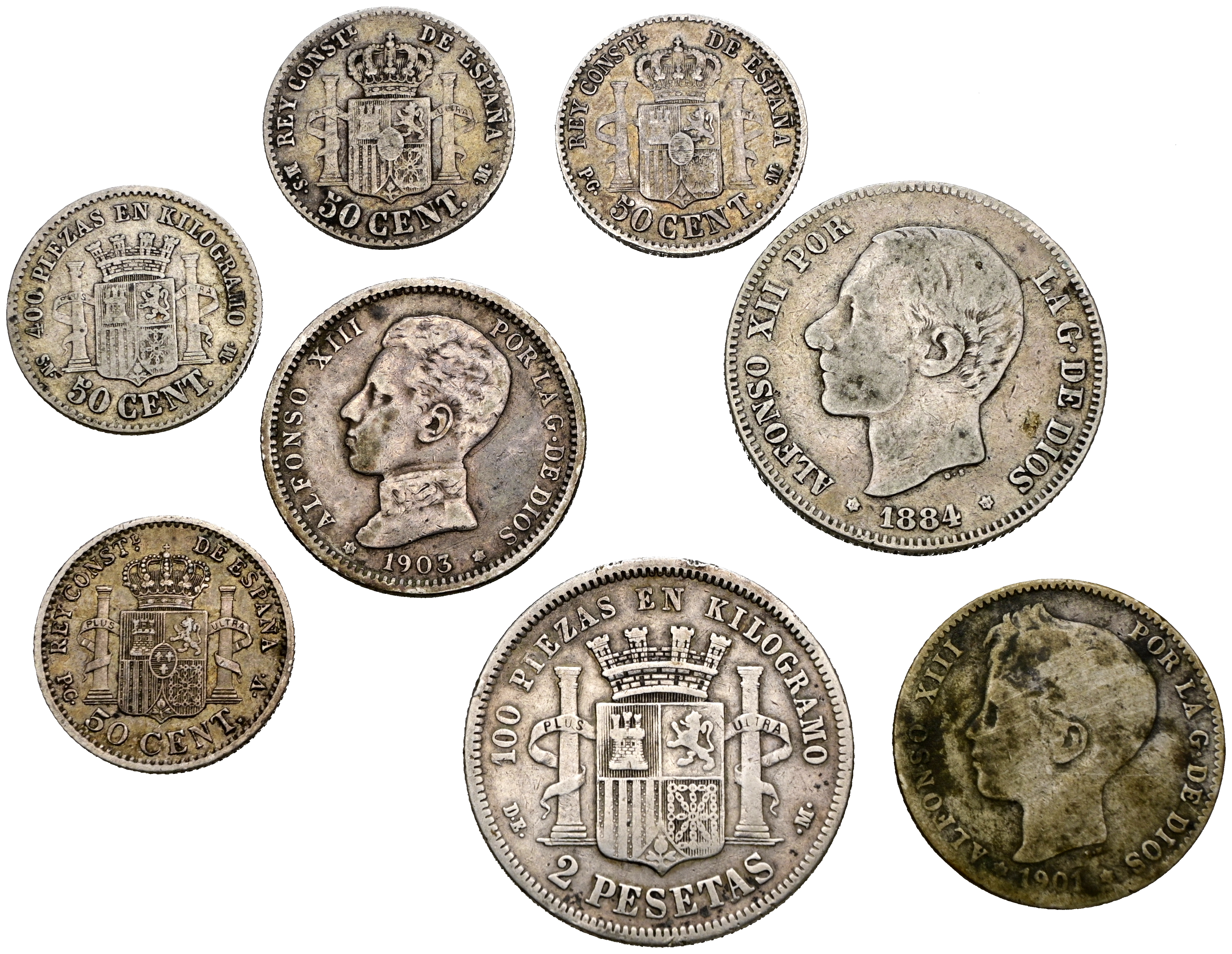 CENTENARIO DE LA PESETA. Conjunto de 8 monedas de plata con módulos de 50 Céntimos y 1 y 2 Pesetas acuñadas bajo el Gobierno Provisional, Alfonso XII y XIII. Sin piezas repetidas. Diferentes estados de conservación. A EXAMINAR.
