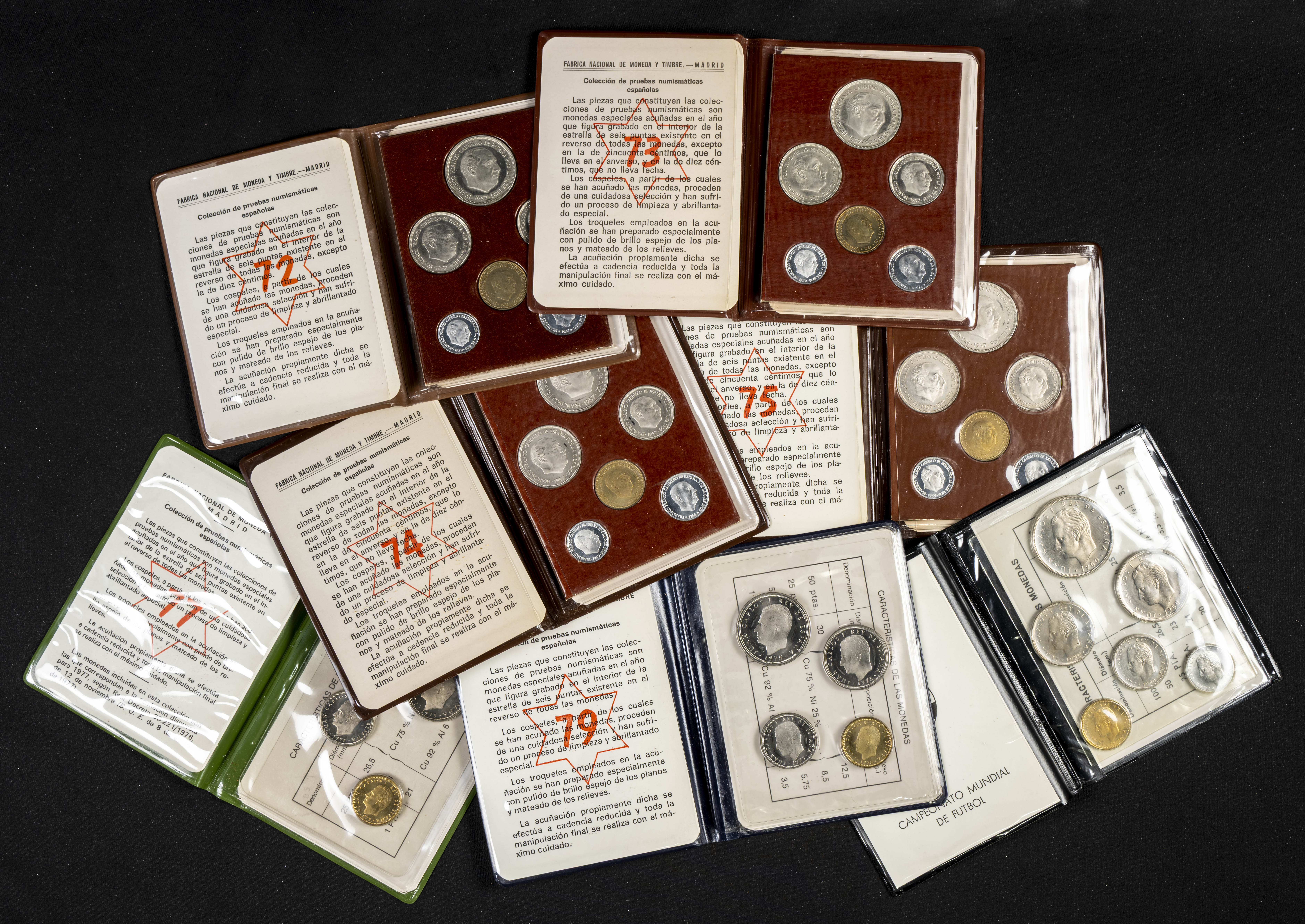 ESTADO ESPAÑOL Y JUAN CARLOS I. Conjunto de 7 carteras completas. Años de emisión: 1972,1973, 1974, 1975, 1977, 1979 y 1980. Perfecto estado de conservación. A EXAMINAR.