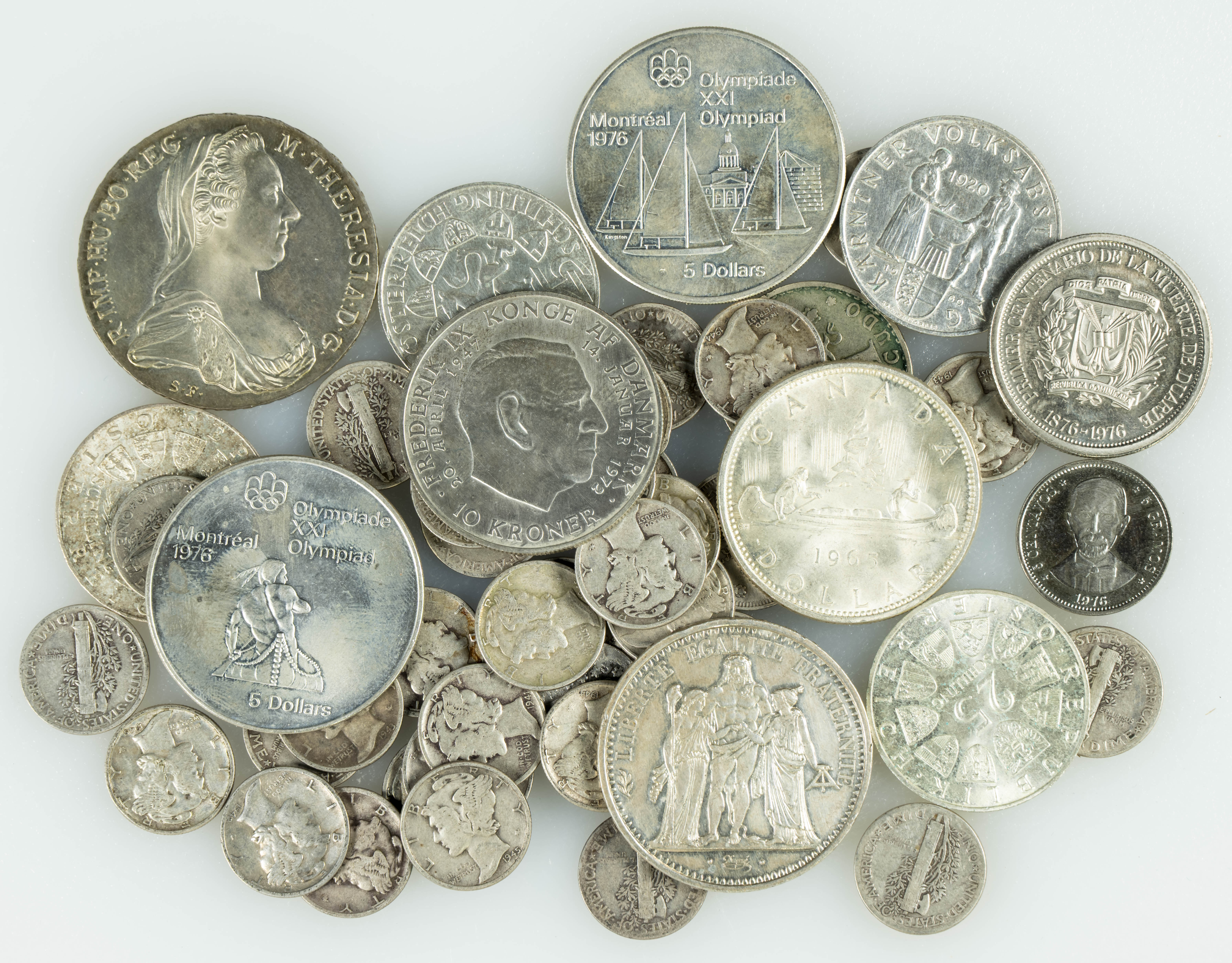 MONEDAS EXTRANJERAS. Conjunto de más de 50 monedas, principalmente del siglo XX, en su gran mayoría de plata y de diversos países, módulos y fechas. Diferentes estados de conservación. A EXAMINAR.