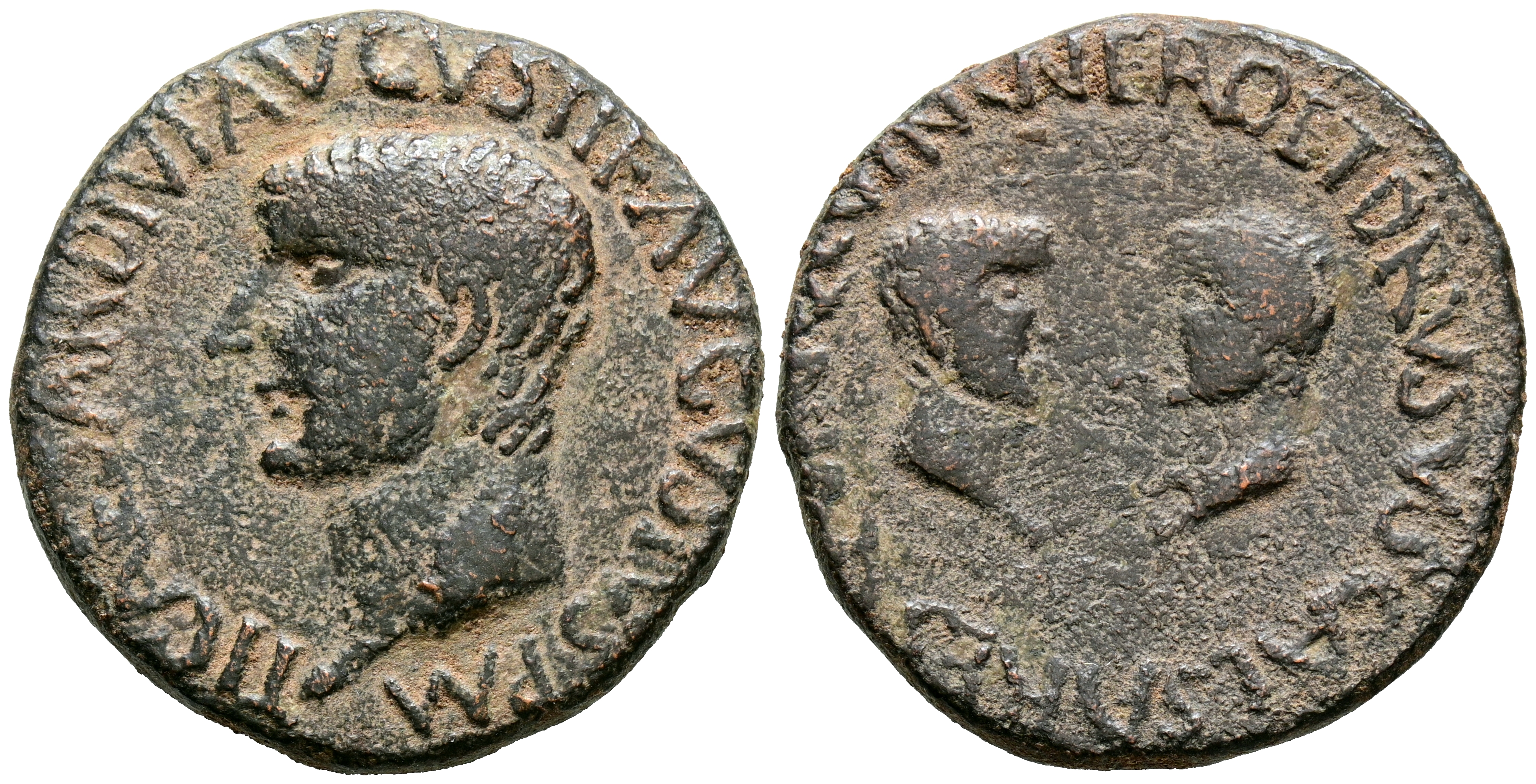 CARTAGONOVA (Cartagena, Murcia). As. (Ae. 11,89g/28mm). 14-36 d.C. (FAB-600). Anv: Cabeza de Tiberio a izquierda, alrededor leyenda: TI CAESAR DIVI AVGVSTI F AVGVSTVS. Rev: Cabezas enfrentadas de Nero y Druso, alrededor leyenda: NERO ET DRVSO CAESARES QVINQ C V I N C. MBC-.