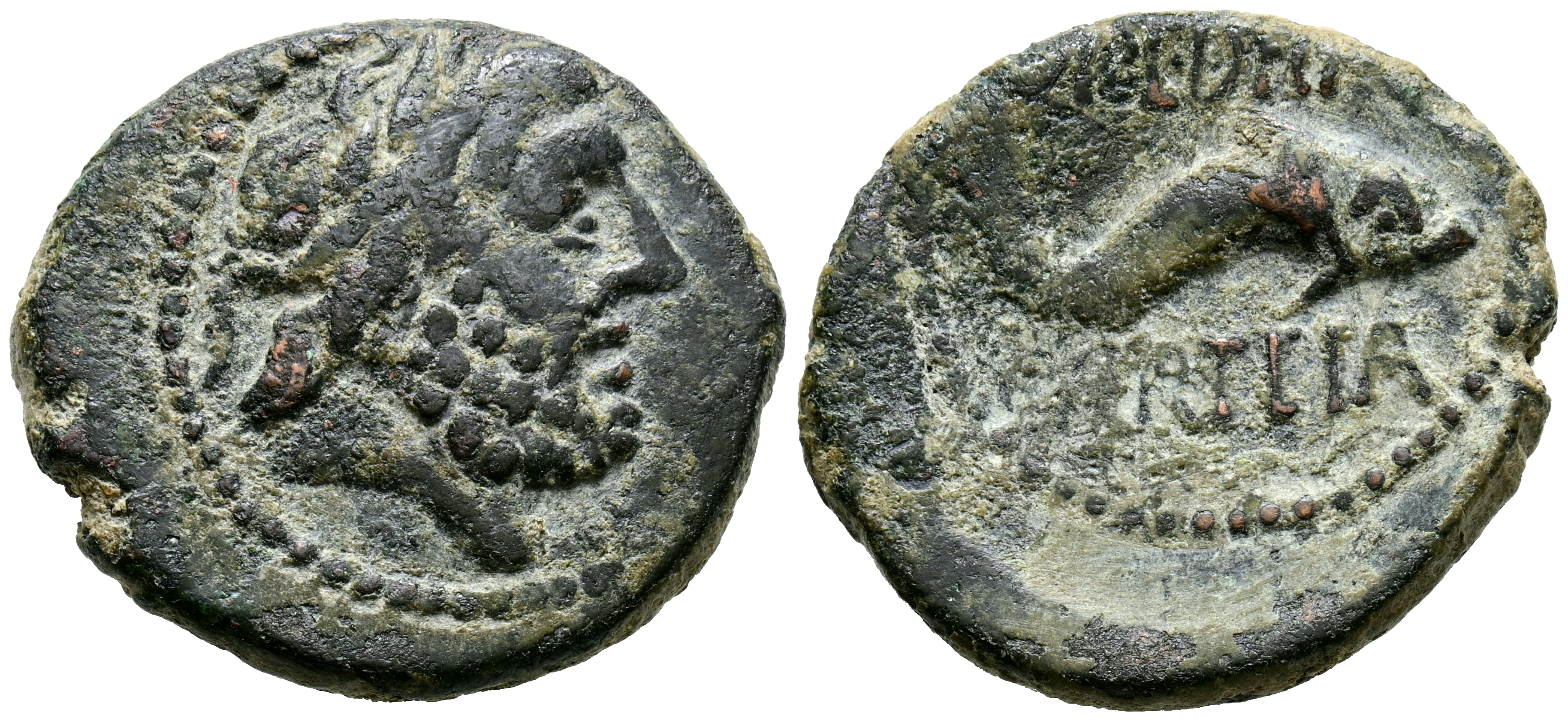 CARTEIA (San Roque, Cádiz). Semis. (Ae. 9,77g/26mm). 27 a.C.-14 d.C. (FAB-645). Anv: Cabeza de Júpiter a derecha, detrás S. Rev: Delfín a derecha, encima Q. PEDECAI, debajo CARTEIA. MBC.