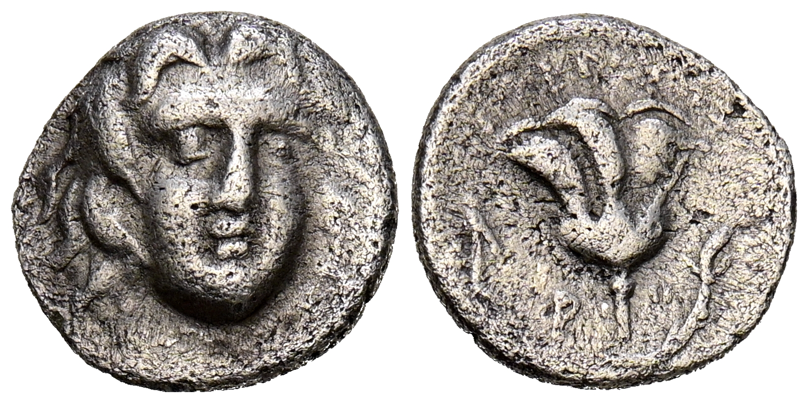 ISLAS DE CARIA, Rhodes. Hemidracma. (Ar. 1,09g/11mm). 250-229 a.C. (SNG Copenhaguen 728). Anv: Cabeza de Helios mirando a derecha. Rev: Rosa con tallo a izquierda, encima: ΑΙΝΗΤΩΡ, a derecha hoja. BC+.