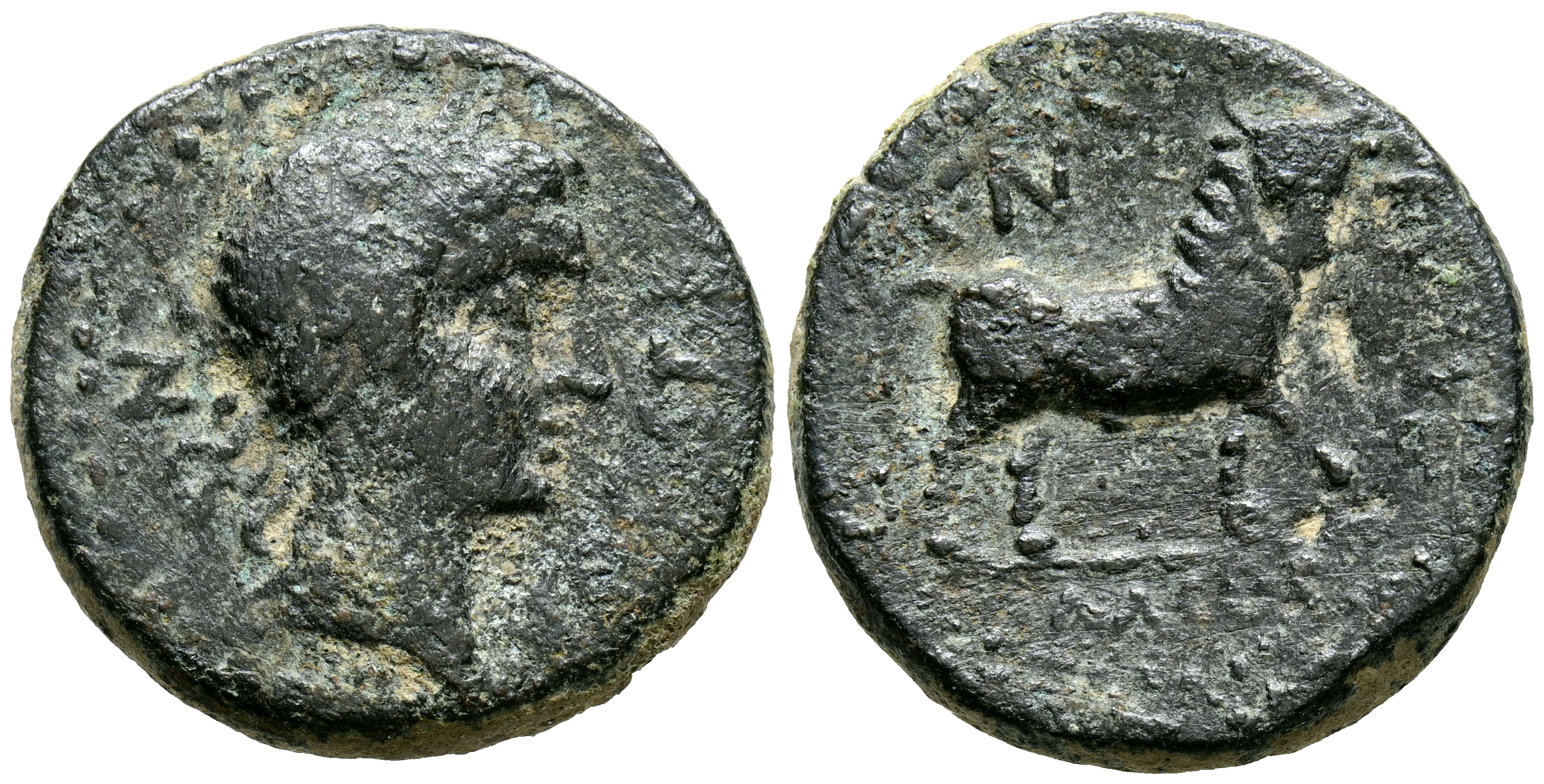 CASTULO (Cazlona, Jaén). Semis. (Ae. 9,09g/24mm). 180 a.C. (FAB-728). Anv: Cabeza masculina diademada a derecha, alrededor leyenda: CN VOC STFR. Rev: Toro a derecha, encima: CN creciente, delante: CN FVL CN F, debajo leyenda ibérica: CaSTeLe. MBC.