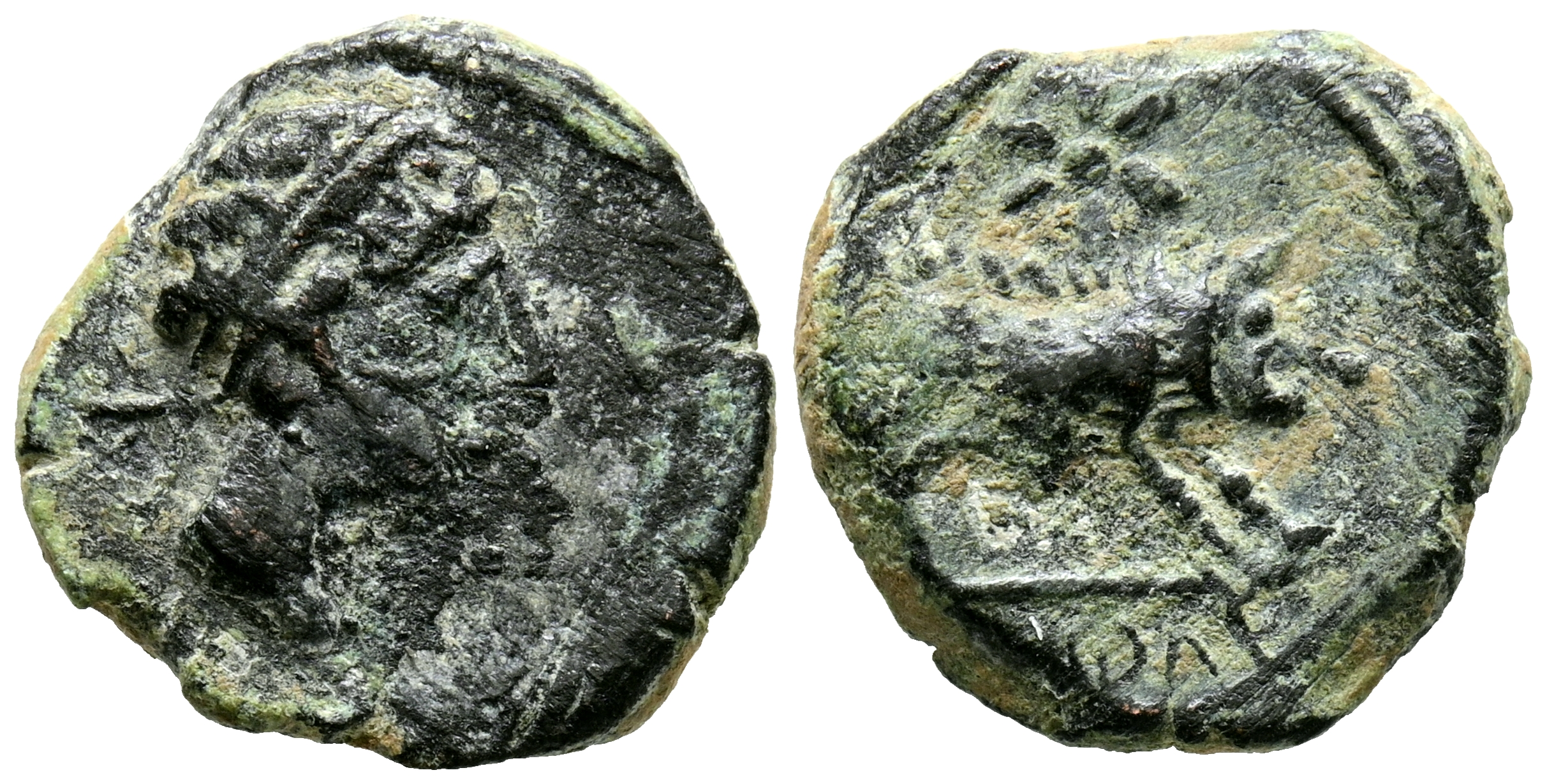 CASTULO (Cazlona, Jaén). Cuadrante. (Ae. 3,46g/17mm). 180 a.C. (FAB-735). Anv: Cabeza masculina diademada a derecha. Rev: Jabalí a derecha, encima estrella, debajo de línea leyenda ibérica: CaSTeLE. MBC-.
