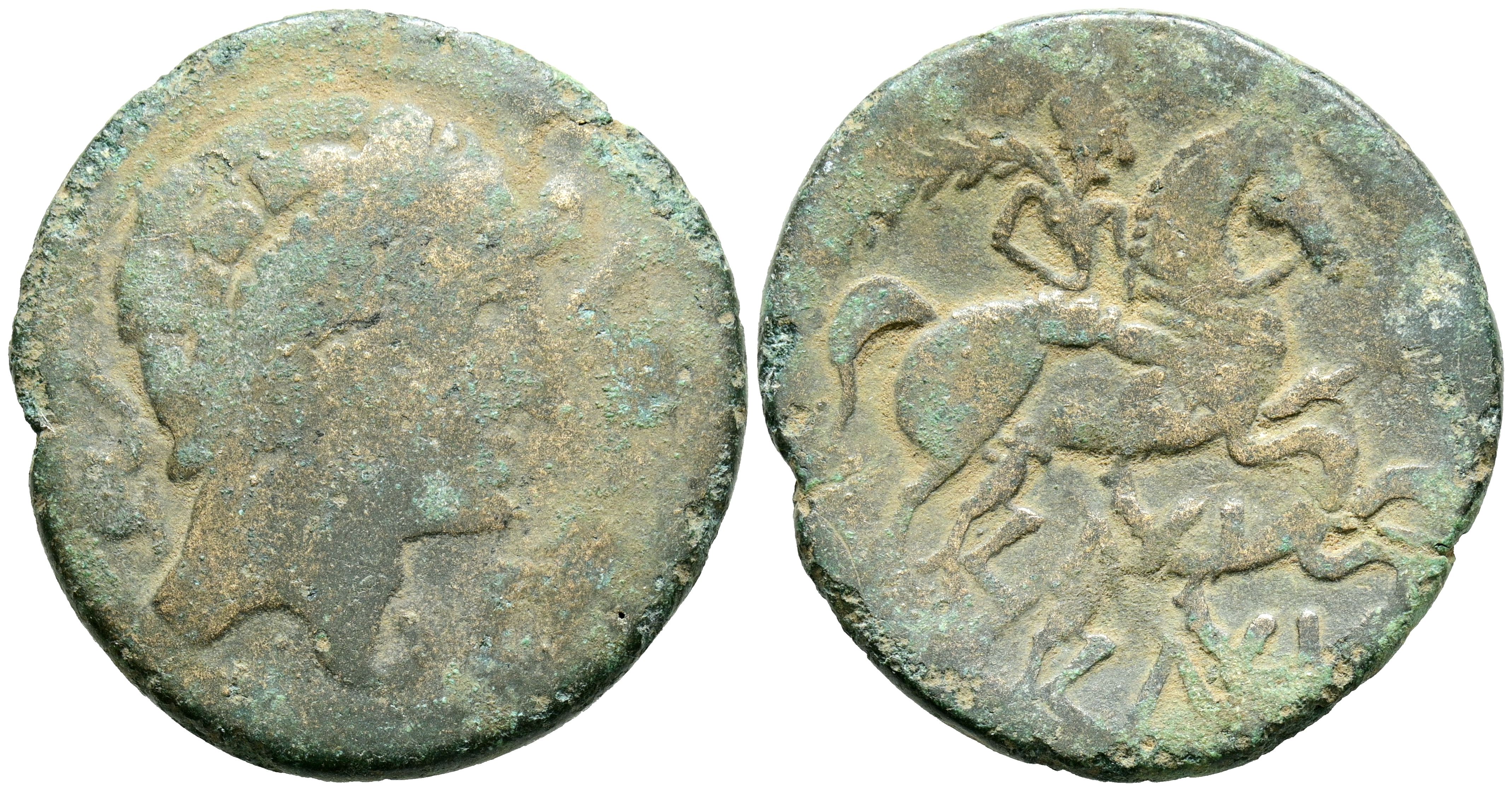 CELSE (Velilla del Ebro, Zaragoza). As. (Ae. 13,14g/31mm). 120-50 a.C. (FAB-771). Anv: Cabeza a derecha con manto y fíbula a derecha, alrededor tres delfines. Rev: Jinete con palma a derecha, debajo leyenda ibérica sobre línea: CeLSE. MBC-. Interesante ejemplar con repinte en reverso.
