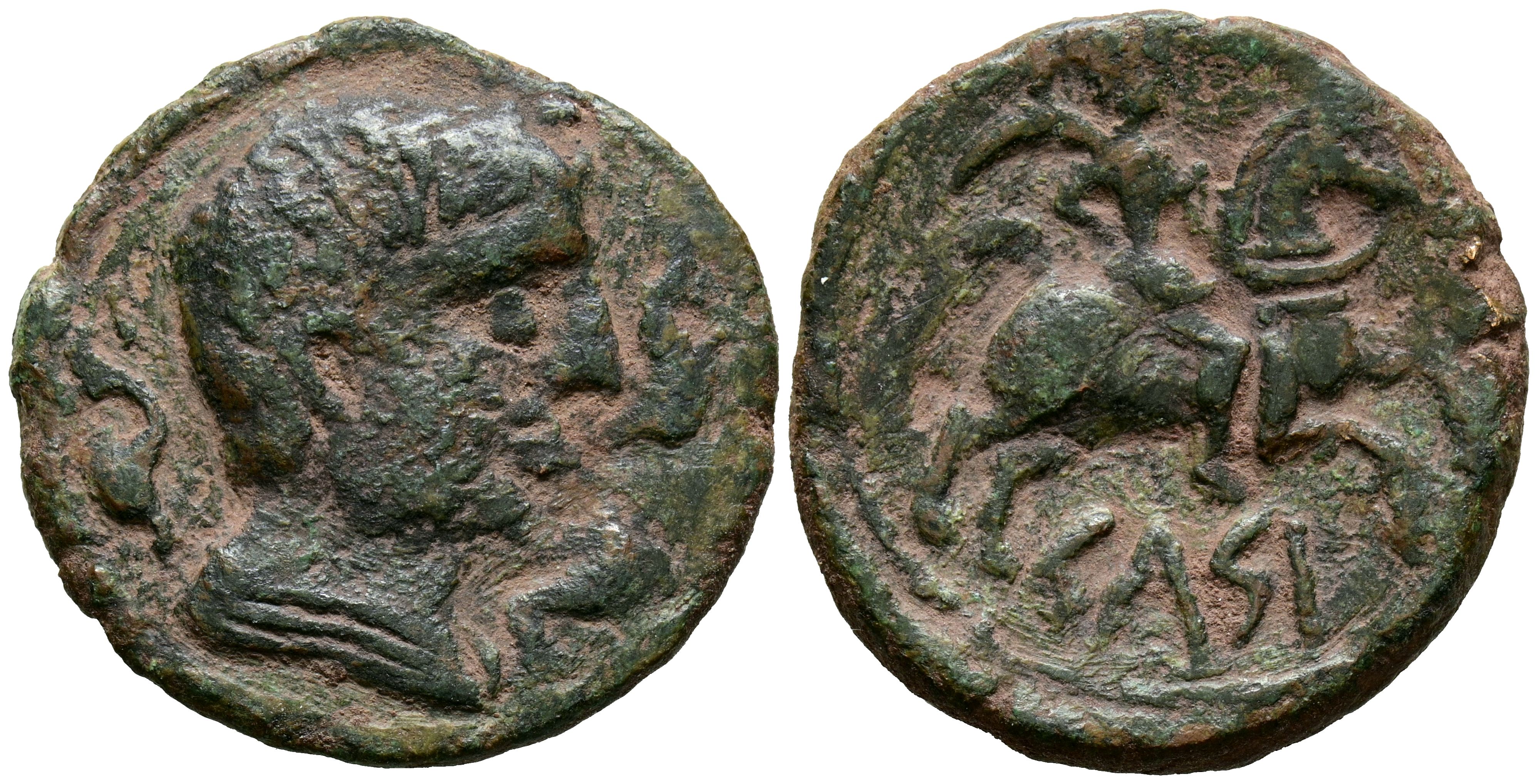 CELSE (Velilla del Ebro, Zaragoza). As. (Ae. 11,30g/28mm). 120-50 a.C. (FAB-771). Anv: Cabeza a derecha con manto y fíbula a derecha, alrededor tres delfines. Rev: Jinete con palma a derecha, debajo leyenda ibérica sobre línea: CeLSE. MBC.