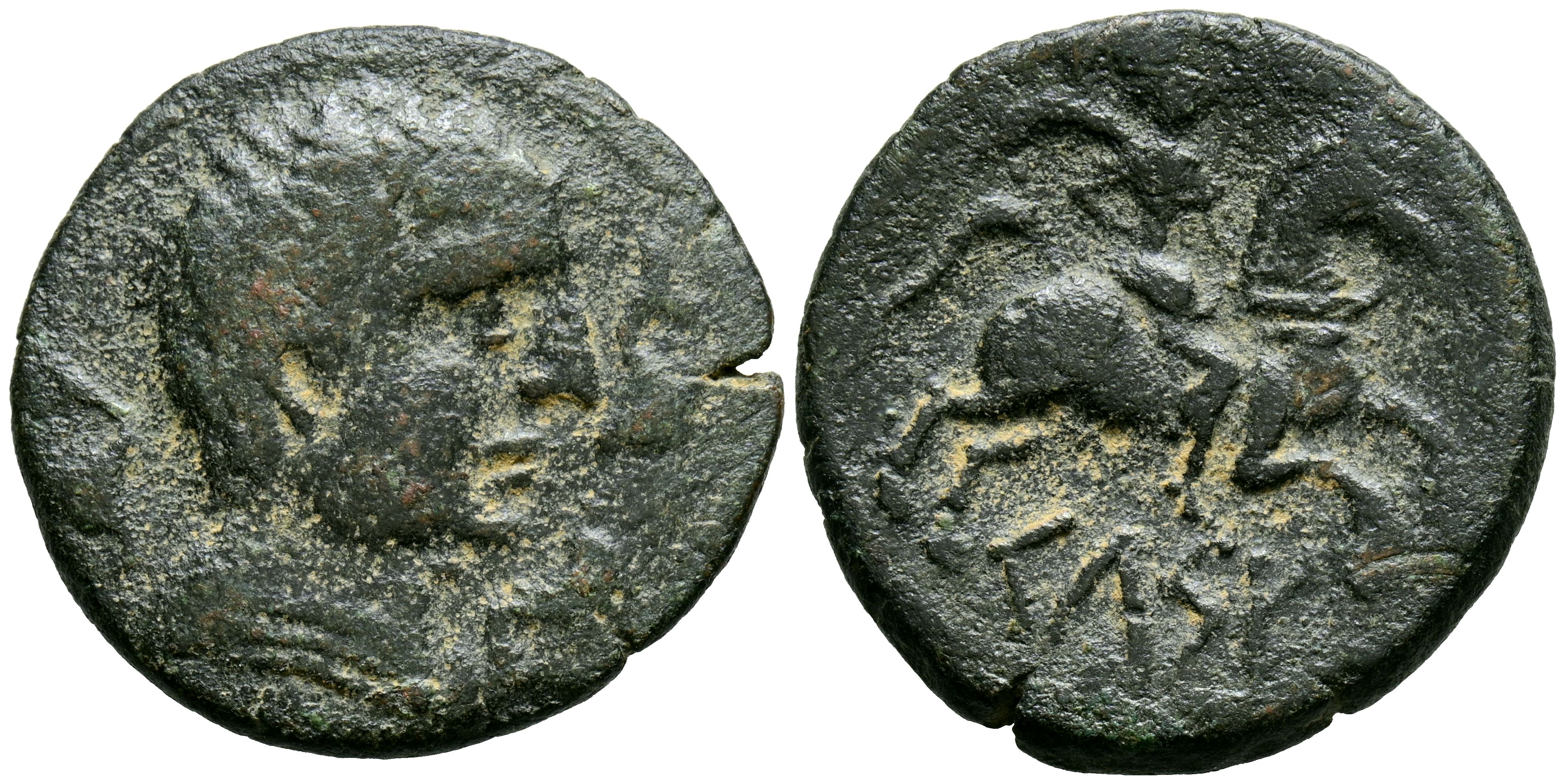 CELSE (Velilla del Ebro, Zaragoza). As. (Ae. 10,46g/28mm). 120-50 a.C. (FAB-771). Anv: Cabeza masculina a derecha con manto y fíbula a derecha, alrededor tres delfines. Rev: Jinete con palma a derecha, debajo leyenda ibérica sobre línea: CeLSE. MBC-.
