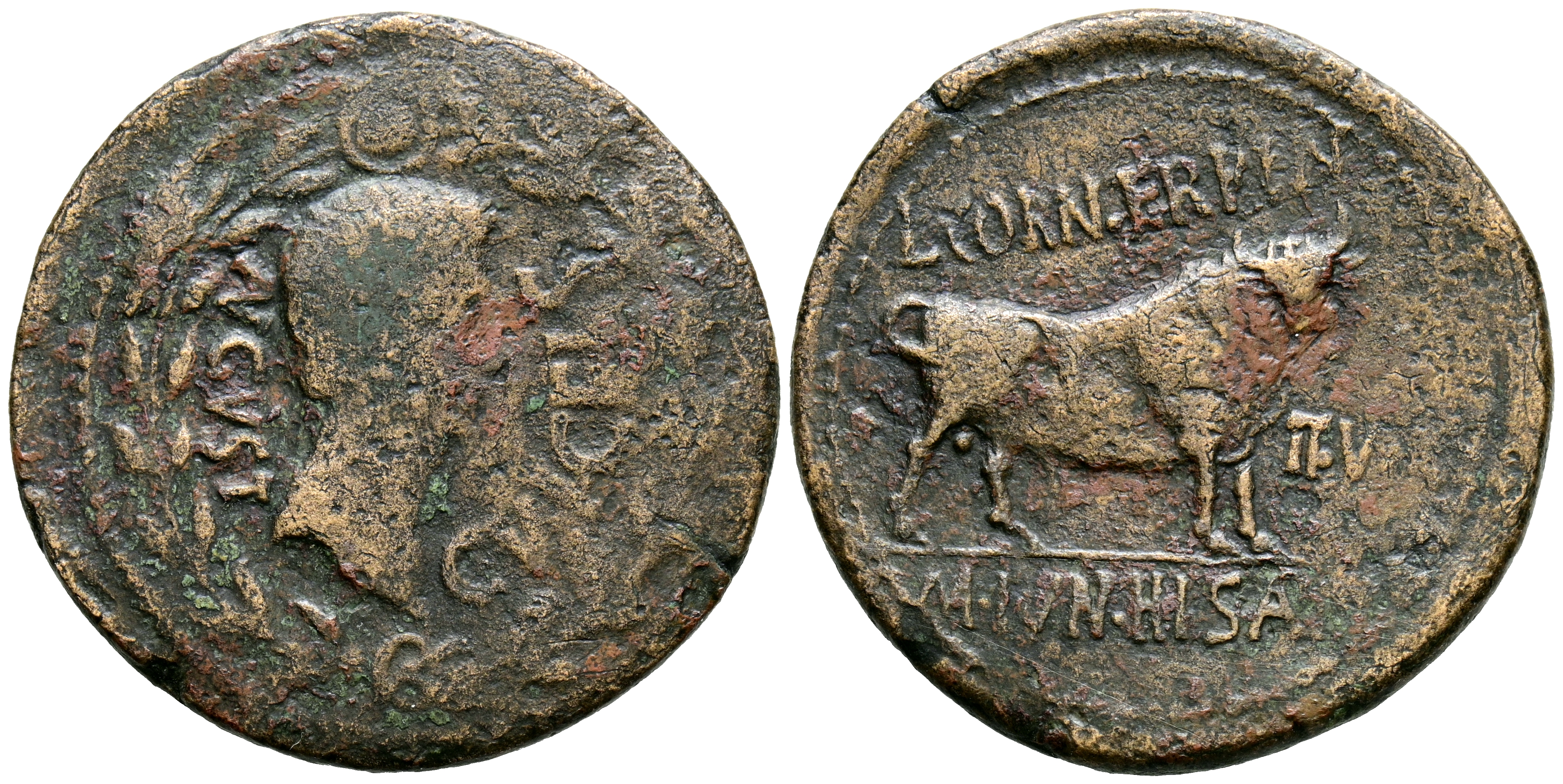 CELSE (Velilla del Ebro, Zaragoza). As. (Ae. 9,67g/30mm). 27 a.C-14 d.C. (FAB-806). Anv: Cabeza de Augusto a derecha, alrededor leyenda: AVGVST C VI CELSA, todo dentro de corona de laurel. Rev: Toro estante a derecha, alredeor leyenda: L COR TERR M IVN HISP II VIR. MBC-.