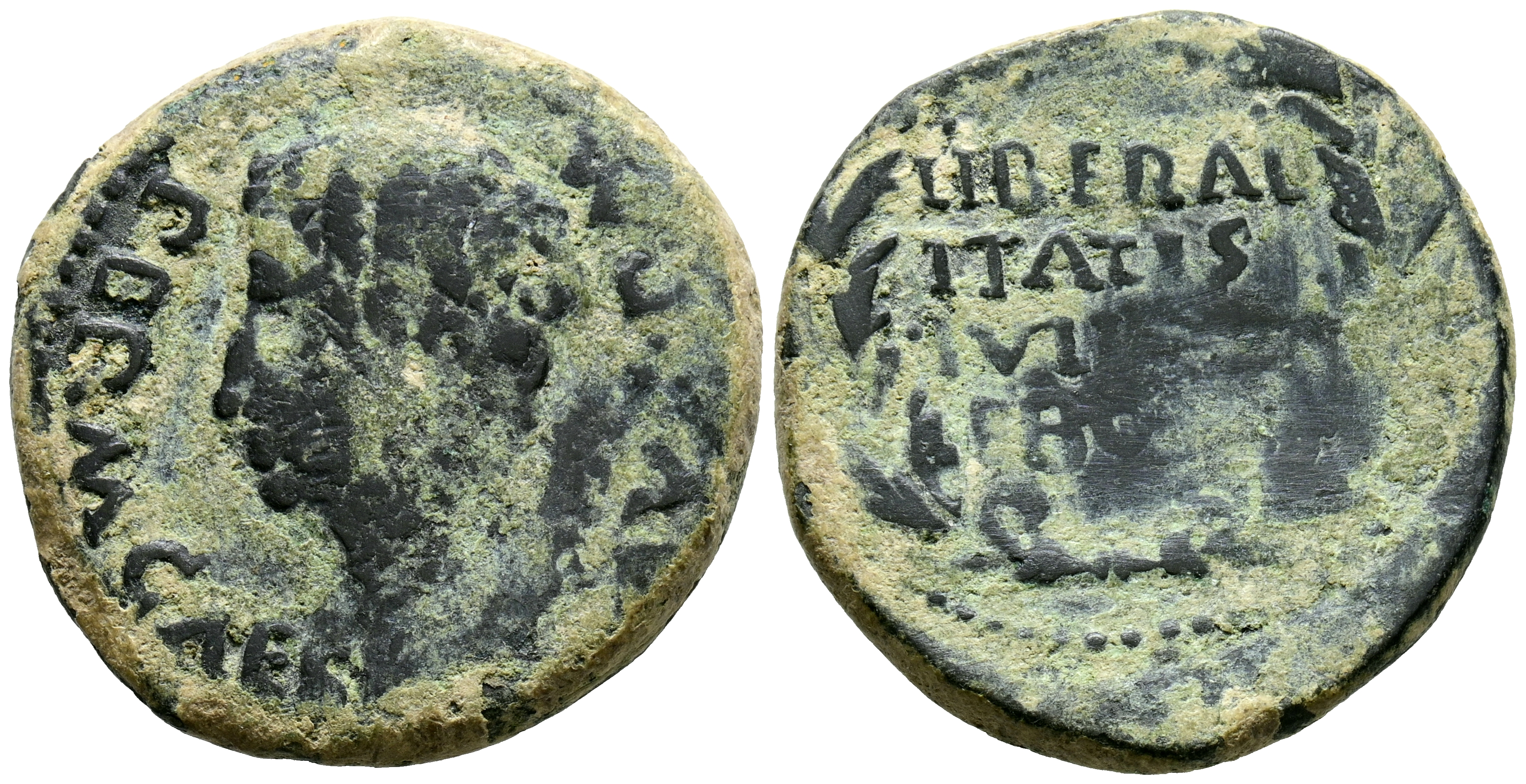 EBORA (Évora, Portugal). As. (Ae. 10,31g/26mm). 27 a.C.-14 d.C. (FAB-901). Anv: Cabeza de Augusto a izquierda, alrededor leyenda: PERM CAES AVG P M. Rev: Láurea, dentro leyenda en cuatro líneas: LIBERALITATIS/IVLIAE/EBOR. BC+.