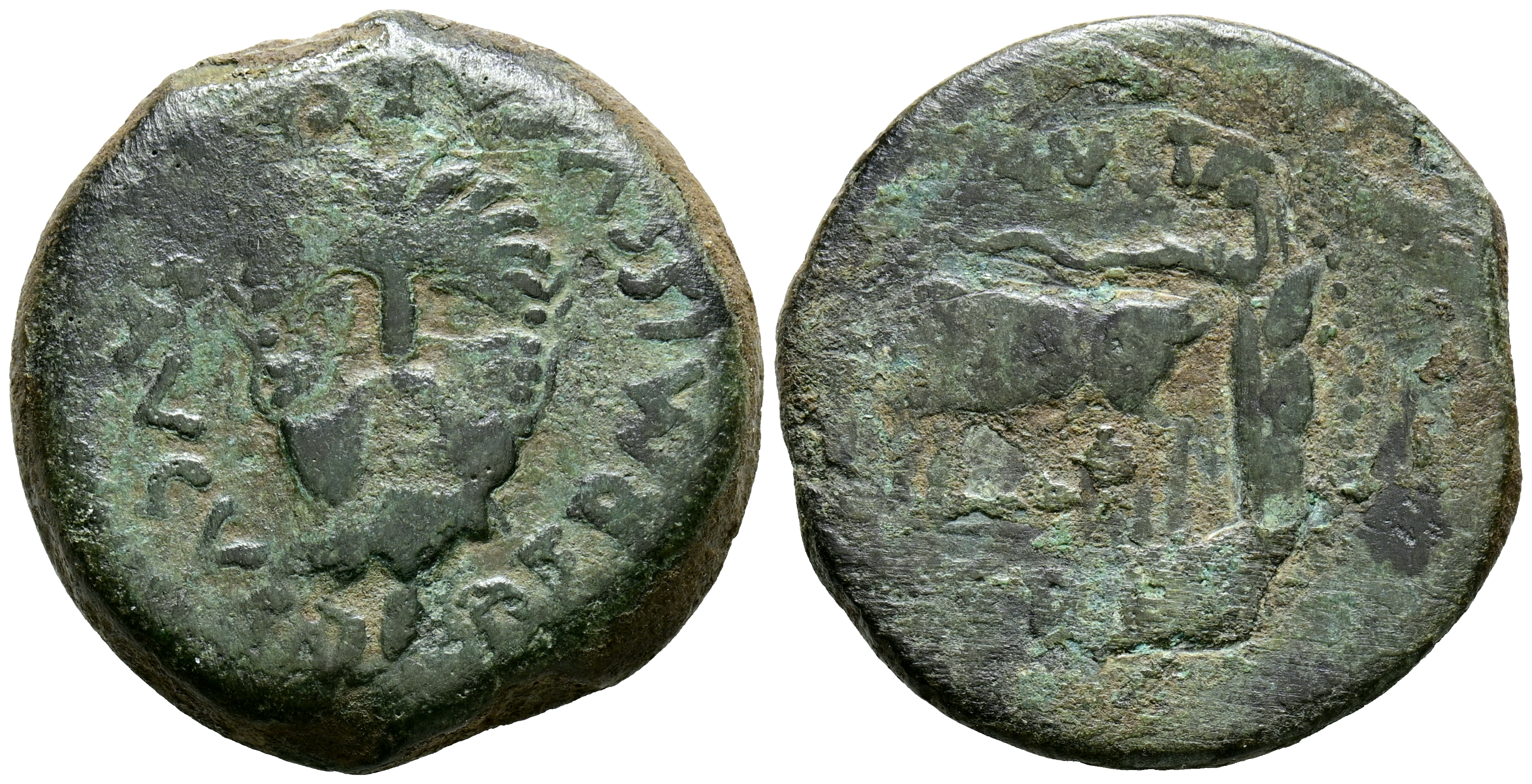 EMERITA AUGUSTA (Mérida). As. (Ae. 11,53g/26mm). 22 a.C.-14 d.C. (FAB-1009). Anv: Cabeza barbada de frente, debajo ánfora, alrededor leyenda: PERMISSV CAESARIS AVGVSTI. Rev: Yunta a izquierda, encima leyenda: AVGVSTA, debajo: EMERITA. MBC-.