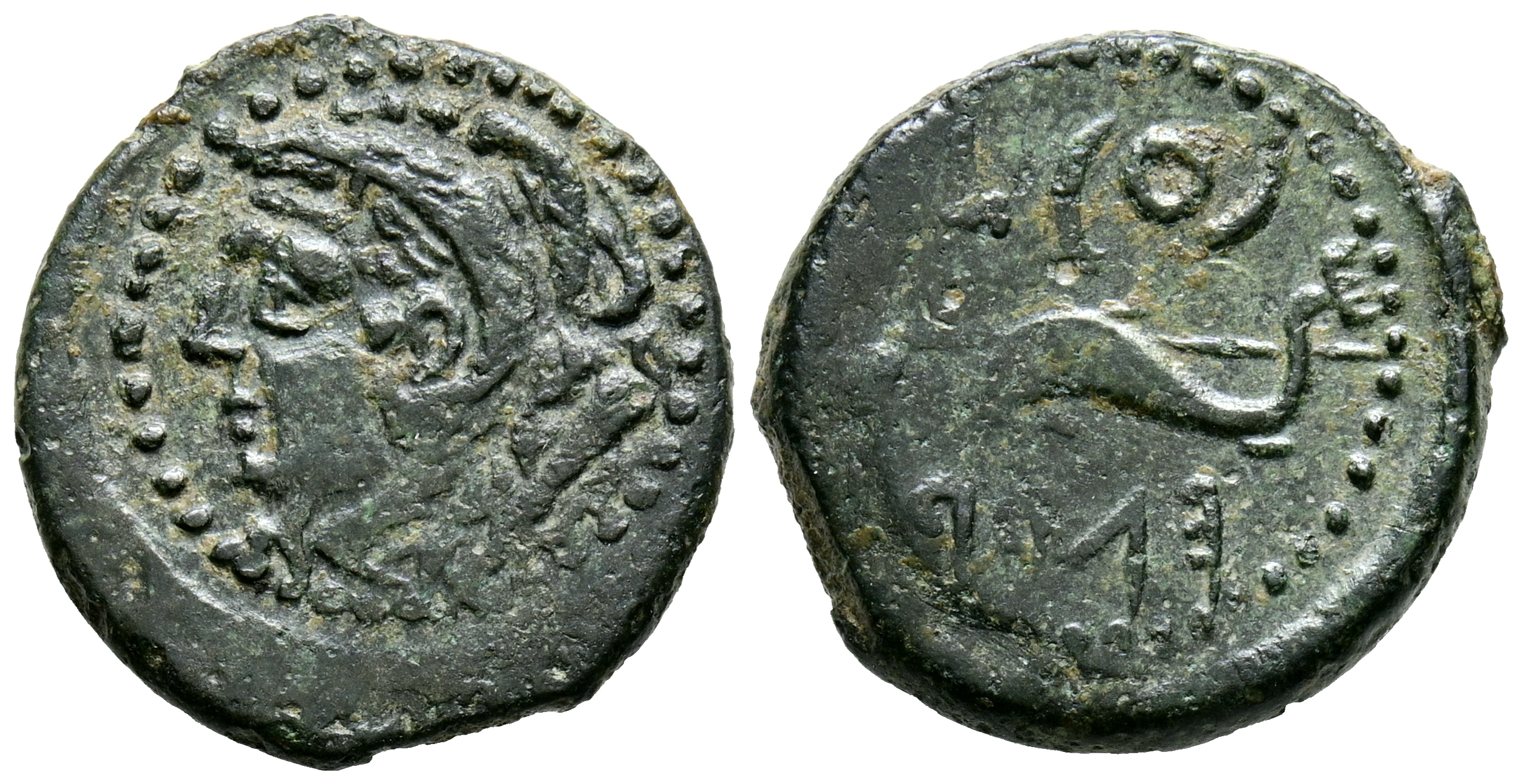 GADES (Cádiz). Cuadrante. (Ae. 3,30g/17mm). 100-20 a.C. (FAB-1356). Anv: Cabeza de Hércules con piel de león a izquierda, detrás clava. Rev: Delfín a izquierda con tridente entre leyenda púnica. MBC+.