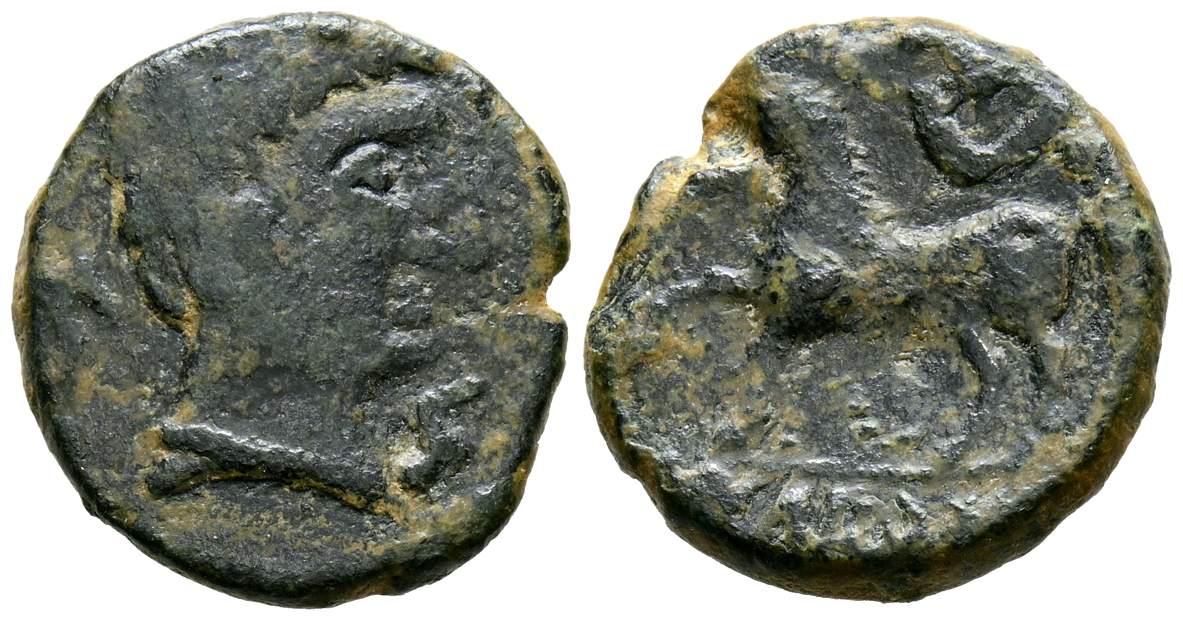 ICALCUSCEN (Iniesta, Cuenca). Semis. (Ae. 3,56g/17mm). 120-20 a.C. (FAB-1401). Anv: Cabeza masculina a derecha, entre delfines. Rev: Caballo a izquierda sobre línea, encima estrella sobre creciente, debajo leyenda ibérica: ICaLCuSCeN. MBC-. Escaso.