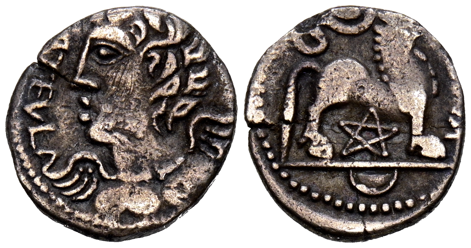 GALIA, Remi. Quinario. (Ar. 1,61g/14mm). Siglo I a.C. (LT 7191; D&T 640). Anv: Busto femenino alado a izquierda, delante leyenda: ATEVLA. Rev: Toro a derecha, encima espiral doble, debajo pentagrama, delante leyenda: VLATOS, en exergo: creciente. MBC.
