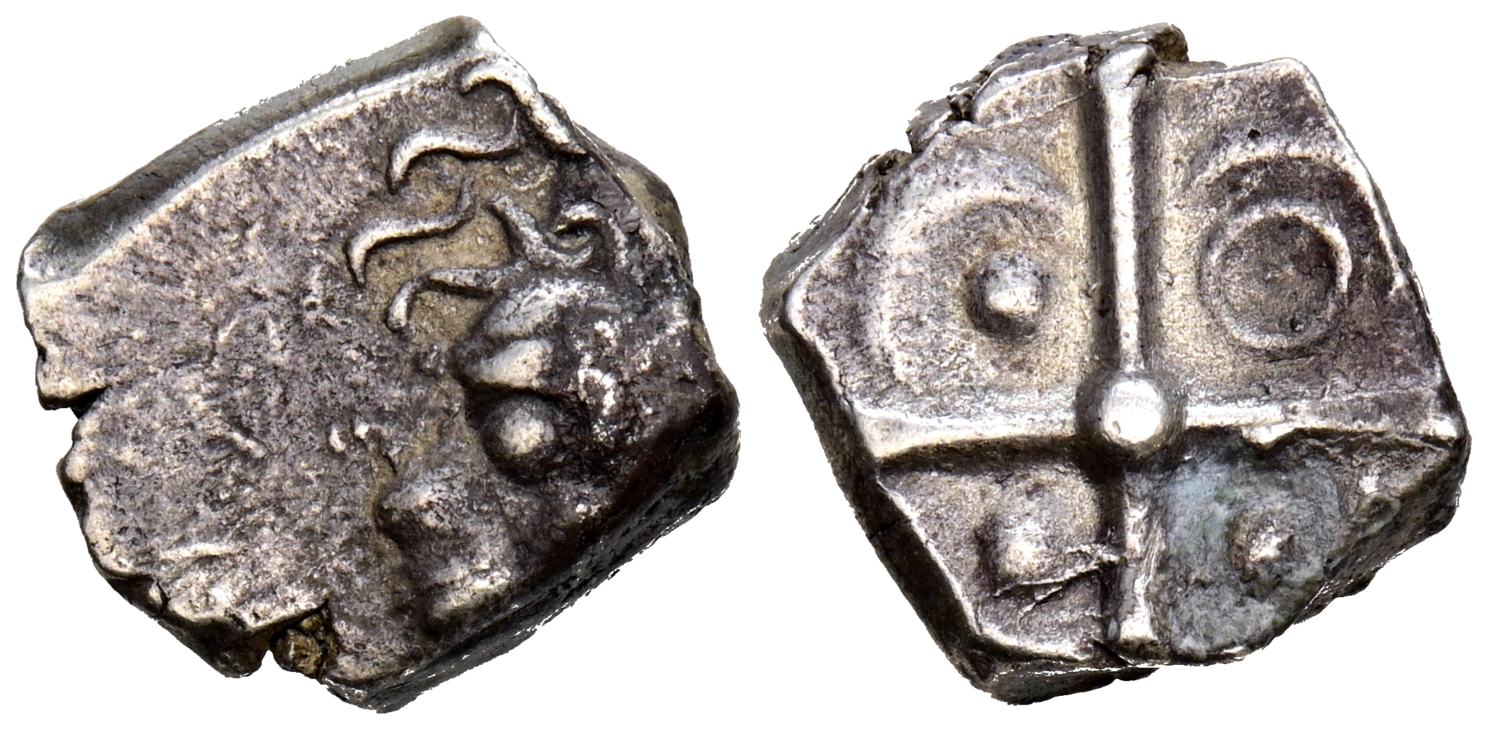 GALIA, Volcae Tectosages. Dracma "à la croix". (Ar. 3,35g/14mm). Siglo III-Siglo I a.C. (Seaby 83 var). Anv: Cabeza a izquierda. Rev: Cruz con punto y creciente en los cuatro cuadrantes. MBC+.