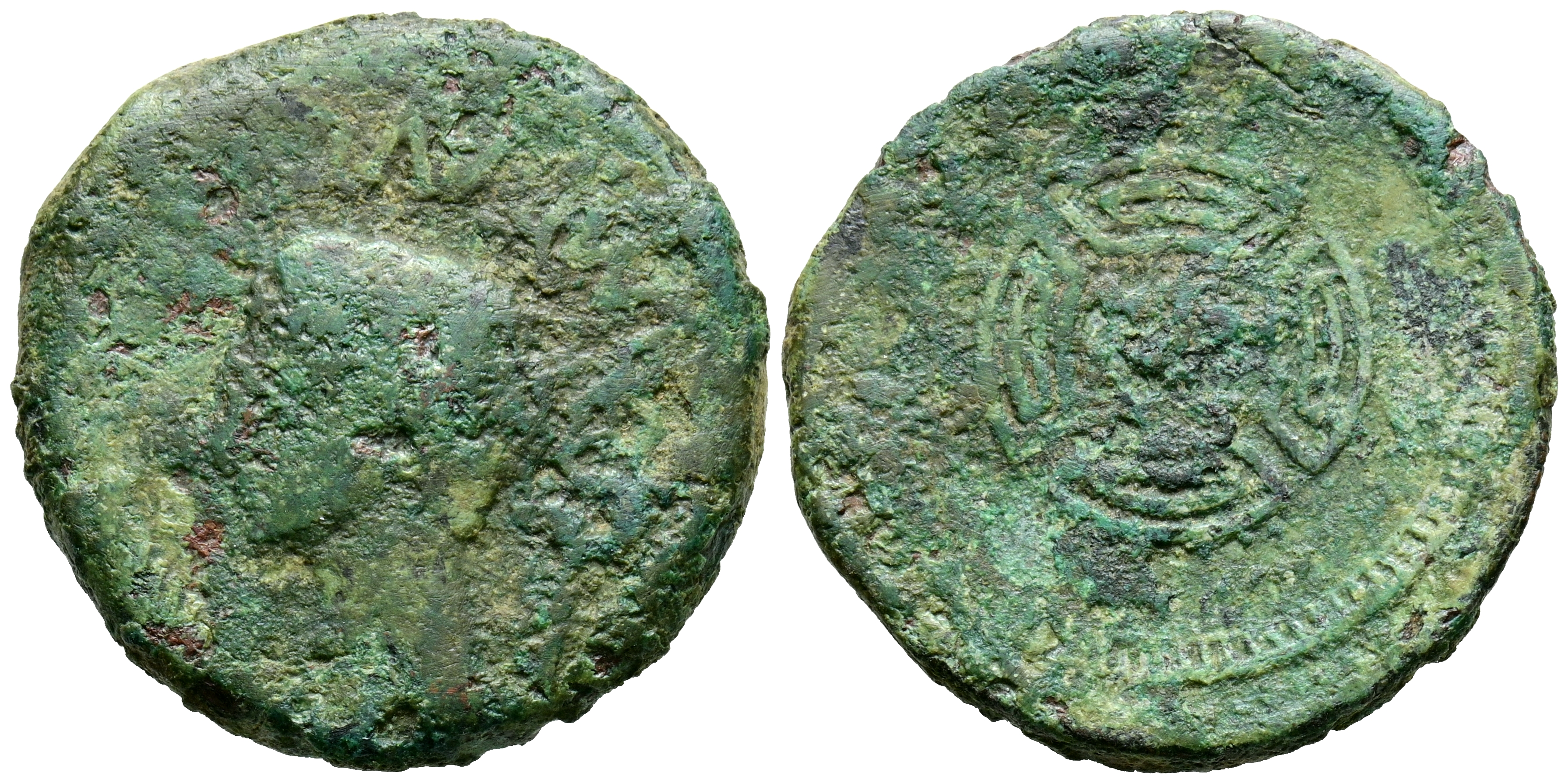 LUCO AUGUSTI (Lugo). As. (Ae. 8,69g/25mm). 27 a.C.-14 d.C. (FAB-1705). Anv: Cabeza de Augusto a izquierda, entre espiga y caduceo, encima leyenda: IMP AVG DIVI F. Rev: Rodela de frente con borde. BC+. Escasa.