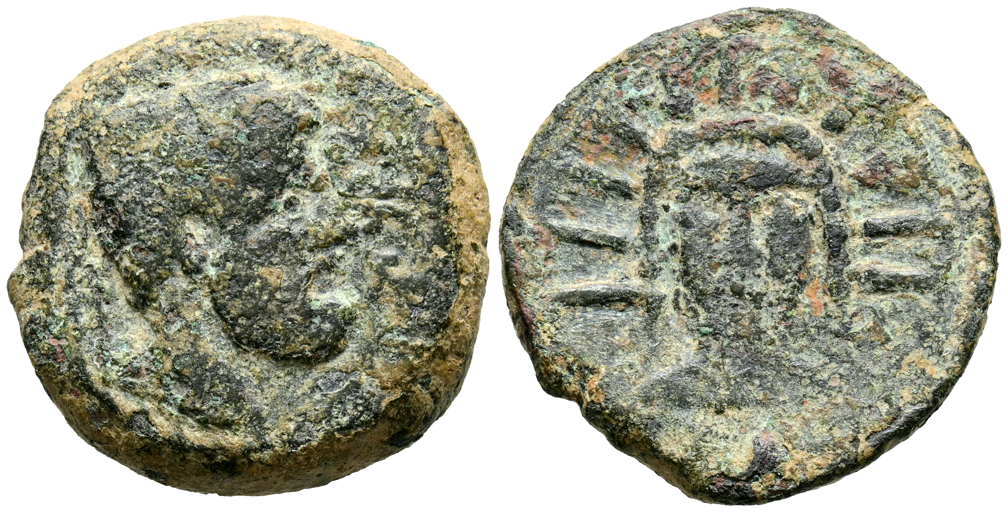 MALACA (Málaga). As. (Ae. 10,34g/24mm). 200-20 a.C. (FAB-1726). Anv: Cabeza de Vulcano a derecha, detrás tenazas y delante leyenda púnica tipo A. Rev: Cabeza de Helios de frente. MBC-.