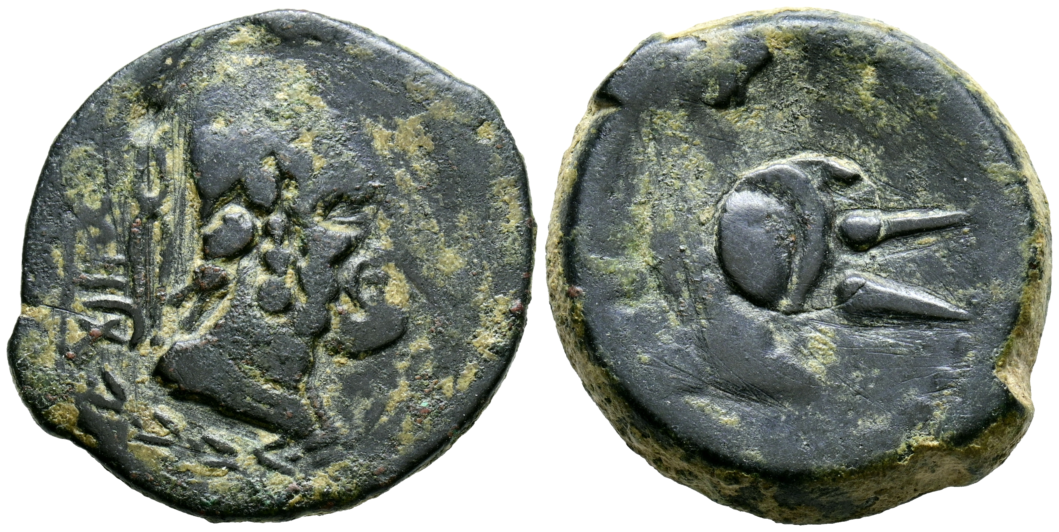 MALACA (Málaga). As. (Ae. 13,20g/27mm). 200-20 a.C. (FAB-1727). Anv: Cabeza de Vulcano a derecha, detrás tenazas y leyenda púnica tipo A. Rev: Cabeza de Helios de frente. BC+. Limpiado.
