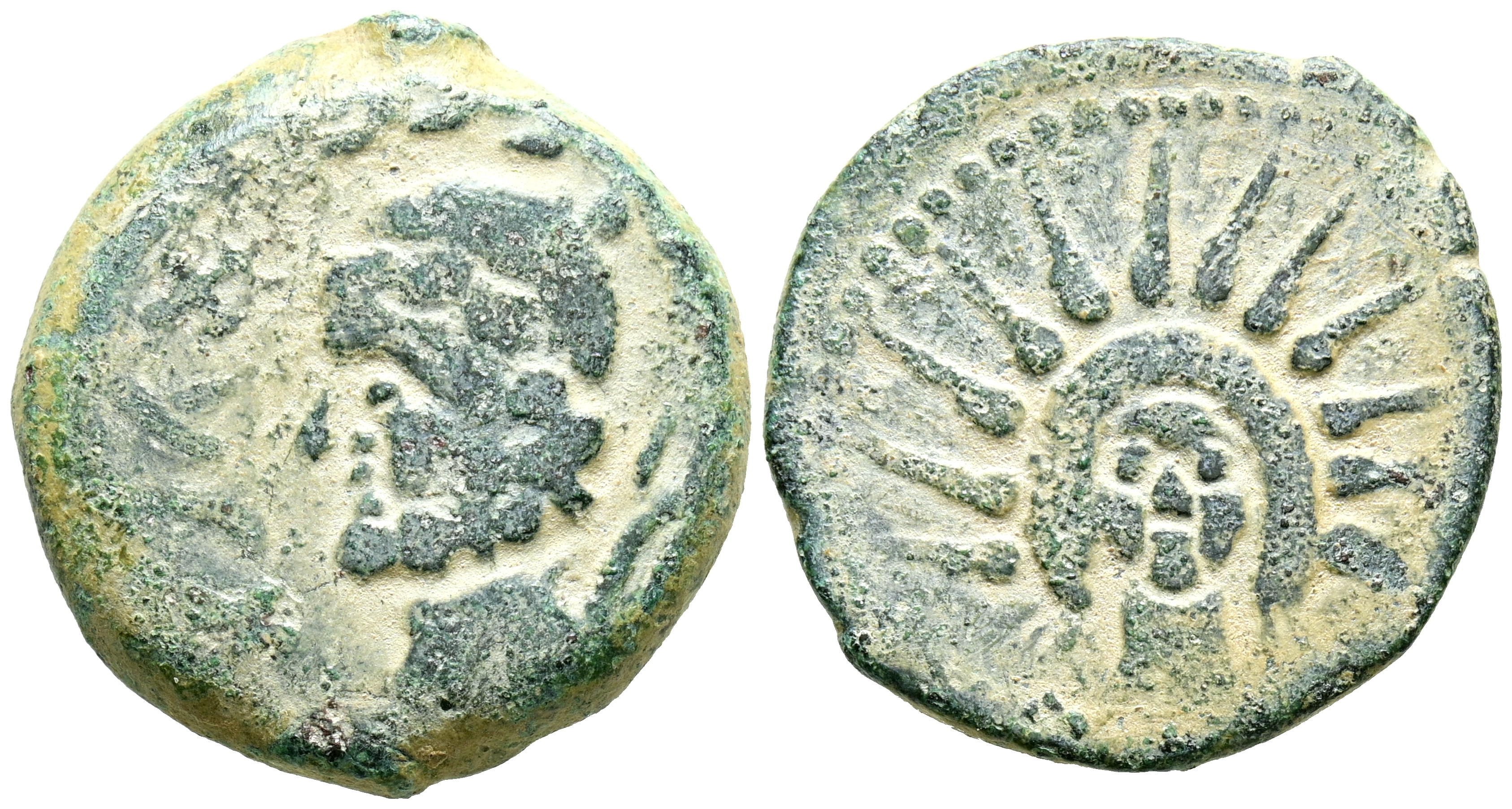 MALACA (Málaga). As. (Ae. 9,17g/25mm). 200-20 a.C. (FAB-1729). Anv: Cabeza de Vulcano a izquierda, delante tenazas, detrás leyenda púnica tipo A. Rev: Cabeza de Helios de frente. MBC-.
