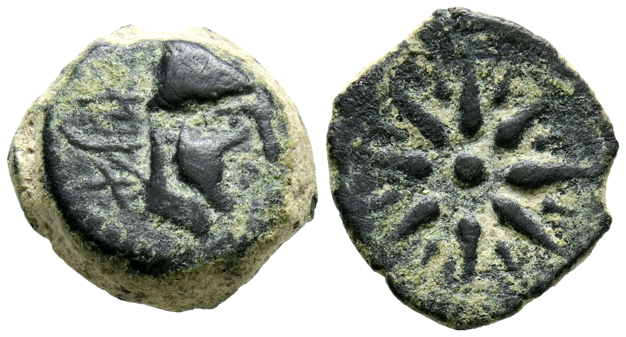 MALACA (Málaga). Sextante. (Ae. 2,88g/15mm). 200-20 a.C. (FAB-1744). Anv: Cabeza de Vulcano a derecha, detrás leyenda púnica tipo A. Rev: Estrella de ocho rayos. MBC.