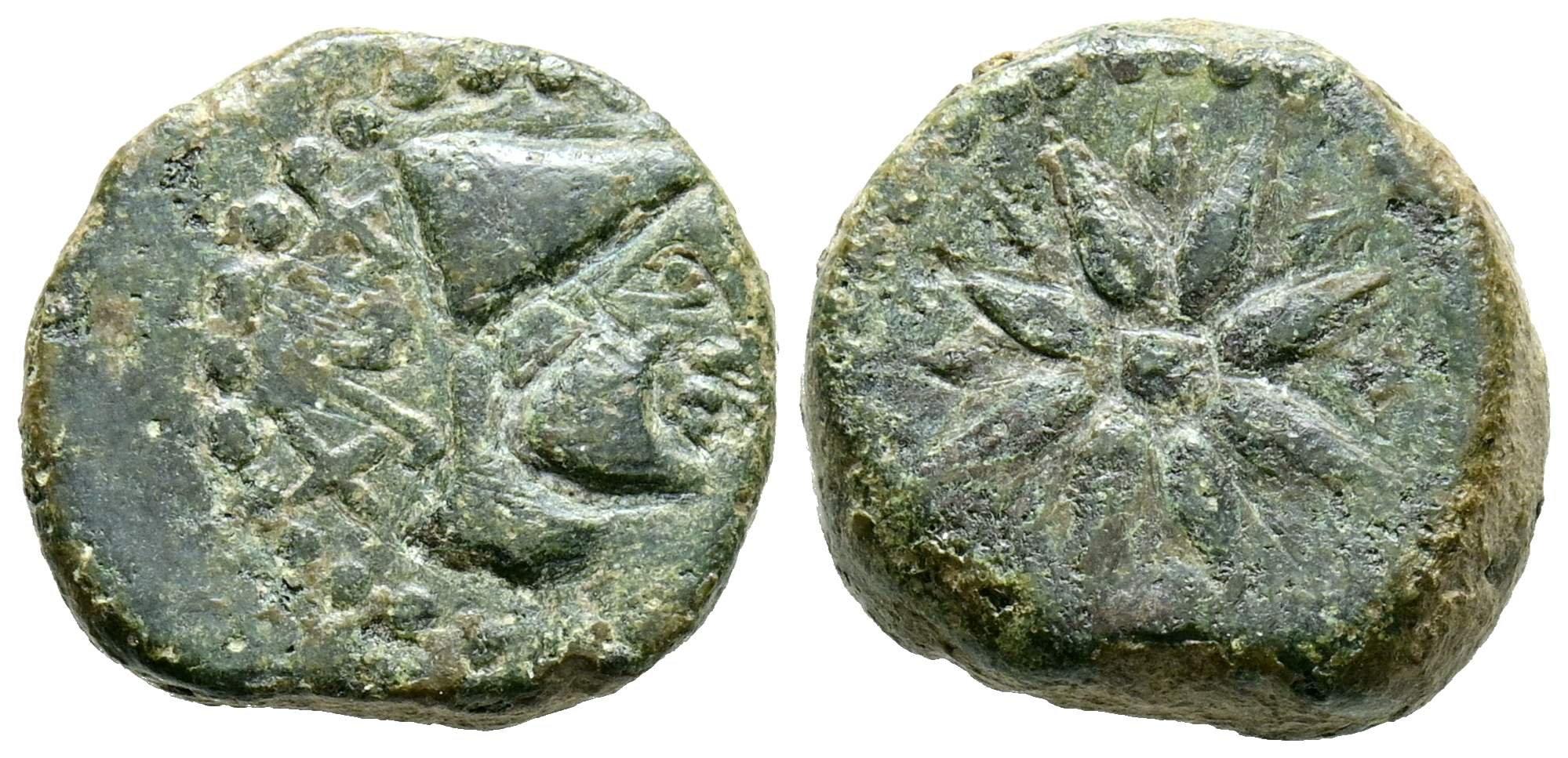 MALACA (Málaga). Sextante. (Ae. 3,42g/14mm). 200-20 a.C. (FAB-1744). Anv: Cabeza de Vulcano a derecha, detrás leyenda púnica tipo A. Rev: Estrella de ocho rayos. MBC.