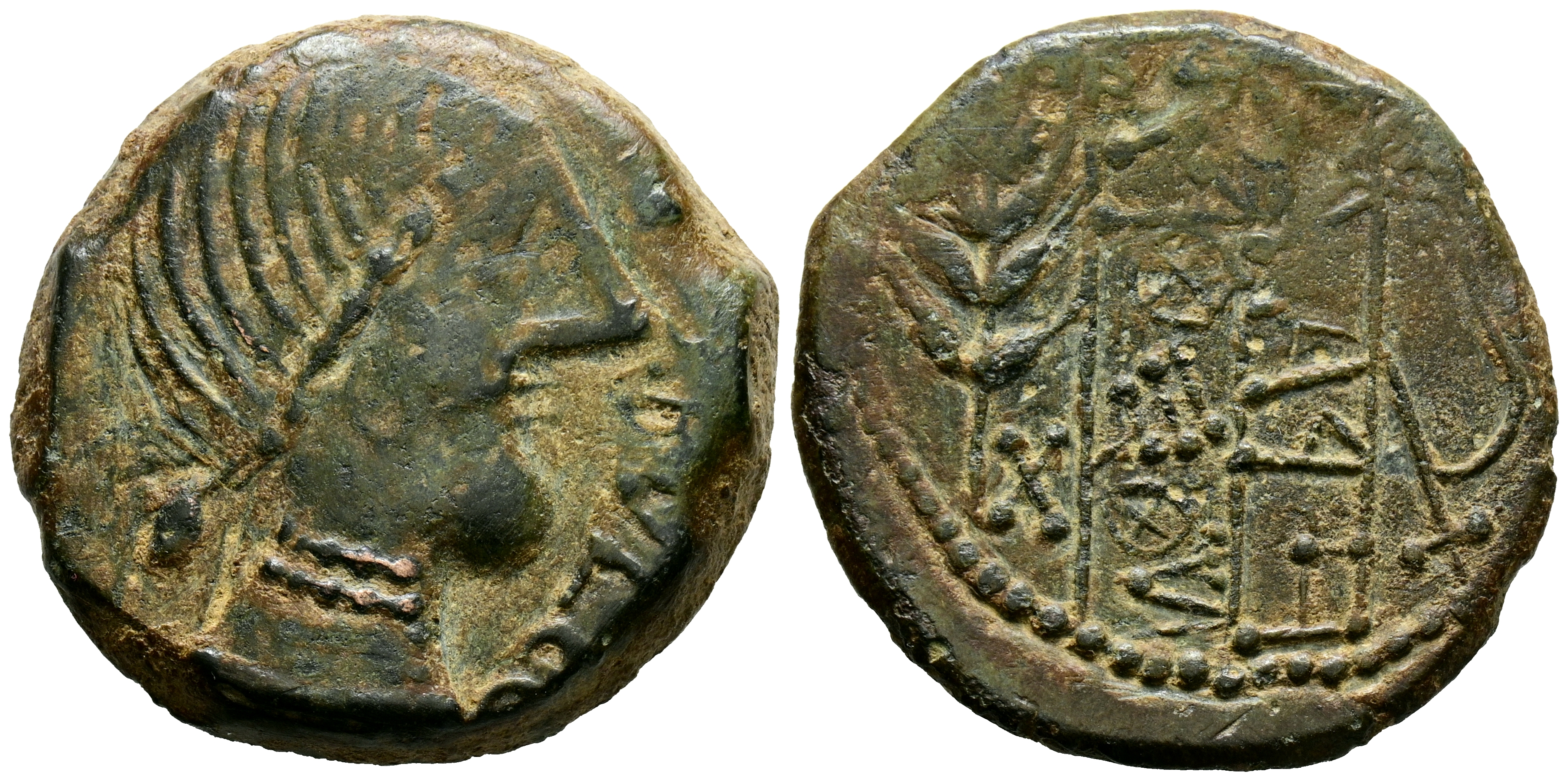 OBULCO (Porcuna, Jaén). As. (Ae. 14,68g/27mm). 220-20 a.C. (FAB-1791). Anv: Cabeza femenina a derecha, delante leyenda: OBVLCO. Rev: Arado a derecha, debajo espiga a izquierda, entre ellos leyenda: ORCaILV/NTuSTuLDuCo, letra: Ta encima de espiga. MBC.