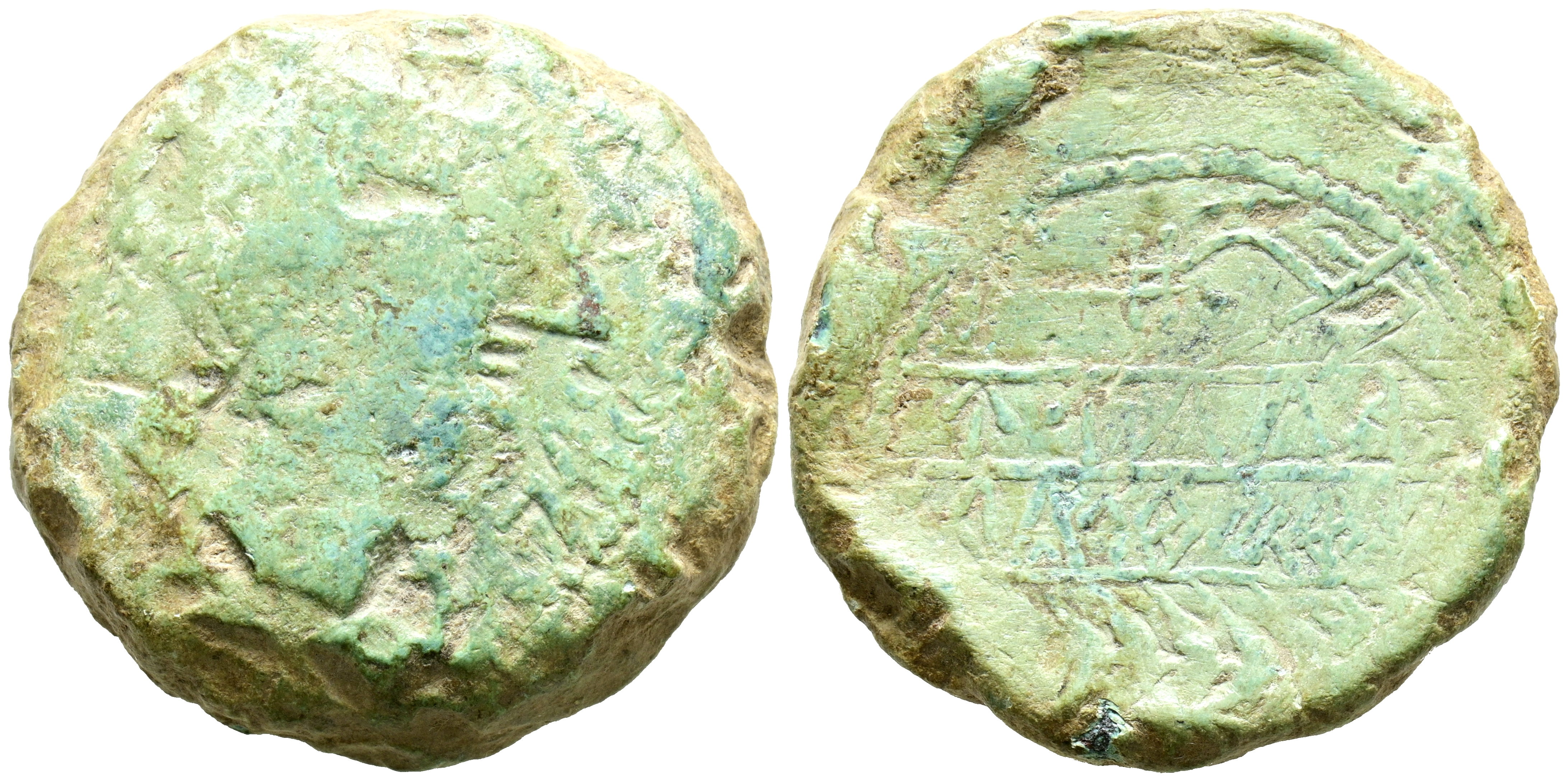 OBULCO (Porcuna, Jaén). As. (Ae. 31,02g/31mm). 220-20 a.C. (FAB-1791). Anv: Cabeza femenina a derecha, delante leyenda: OBVLCO. Rev: Espiga a derecha, debajo espiga a izquierda, entre ellos leyenda: ISCeRATeN/UIUBoLAI, sobre la espiga, letra ibera: Ta. MBC-/BC+.